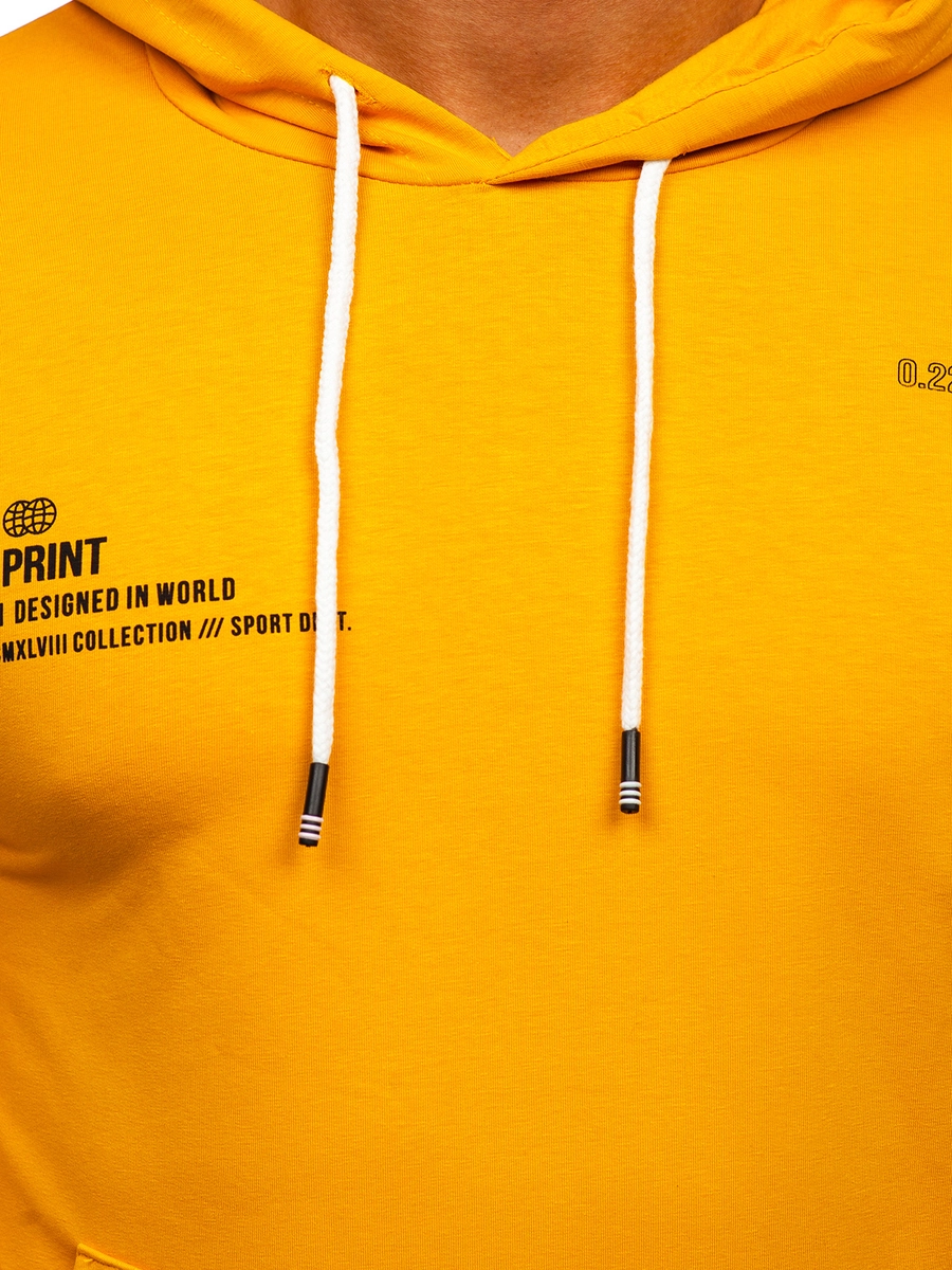 Snygg gul herrhuvtröja med tryck 8754 från Bolfs kollektion. Produkten finns i fyra olika dämpade färger. Nertill och på ärmarna finns en ribbning, vilket gör att den passar de flesta kroppsformer. Väldigt mjukt och skönt material som ger en hög känsla av komfort och bekvämlighet när du bär den. Delikata tryck är ett dekorativt inslag. En känguruficka och en justerbar huva i två lager gör den praktisk. Tröjans sportiga stil tillåter dig att skapa många olika snygga stilar med den. Den är ett måste i varje mans garderob. Ditt val varje dag. Använd den till skolan, på promenaden eller på gymmet. Skapa din sportiga stil ihop med sweatpants och en sportig jacka. För en casual stil, välj jeans och en skinnjacka.