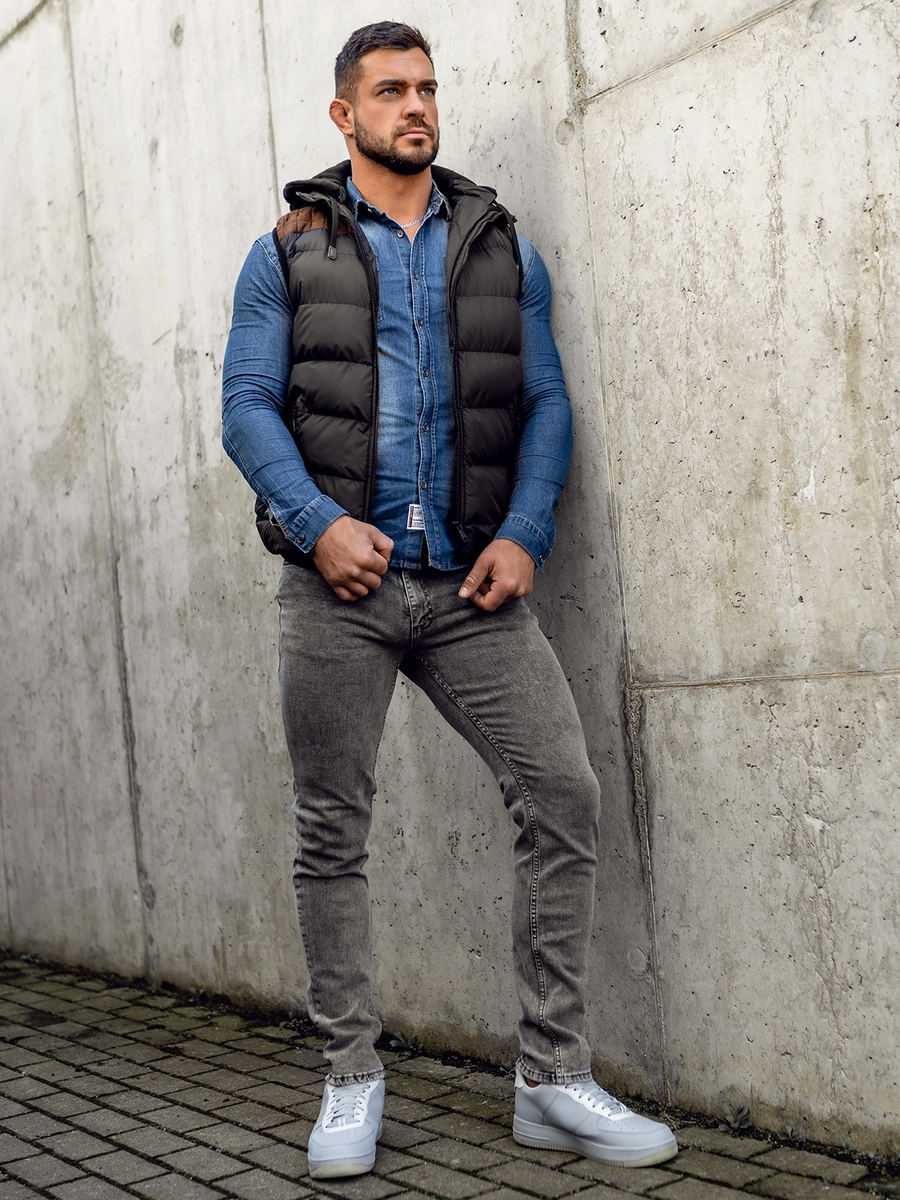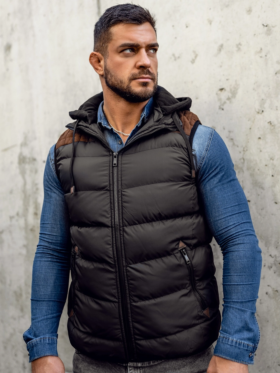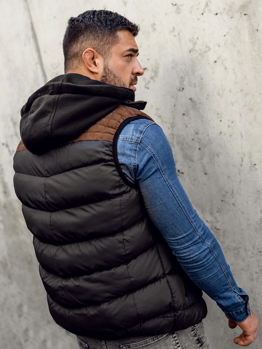 Snygg quiltad svart herrväst med huva B5382 från Bolfs kollektion. Quiltning över hela västen ger den ett sportigt intryck. Den stängs med en dragkedja, har en ståkrage och en avtagbar, justerbar huva. Dess två utvändiga fickor med dragkedja ger den praktisk karaktär. Den har även en invändig ficka utan stängning. Den är tillverkad av 100 % polyester och nertill finns en elastisk mudd. Den här västen med ett klassiskt snitt är ett utmärkt alternativ till jackan under hösten. Den kan ersätta övergångsjackan eller till och med en tröja då den ger bra skydd mot kyla och vind. Västen kan användas som bas i många moderiktiga stilar. Passar bra med en träningsoverall då den ger ett sportigt utseende.