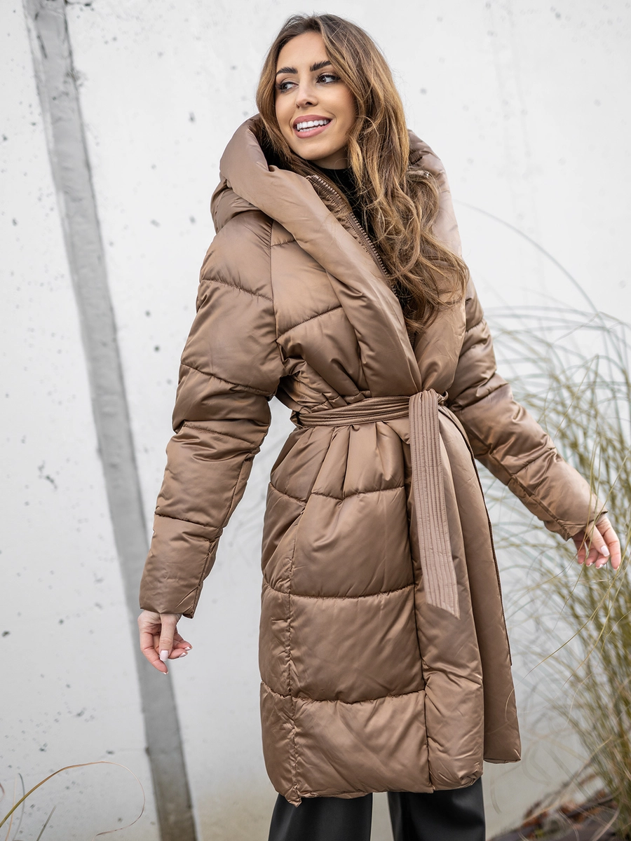 Snygg kamelfärgad lång damvinterjacka med huva MY0363A från Bolfs kollektion. Jackan stängs bekvämt med en dragkedja som kan tas av helt, då kan jackan bäras som en öppen kappa. Den har två sidofickor med dragkedja där du kan förvara dina nycklar eller plånbok på ett säkert sätt. Jackan har även ett bälte som knyts i midjan samt en inbyggd huva, fäst i jackan. Den har en elastisk mudd invändigt på ärmarna vilket gör att den skyddar bra mot kyla. Den är tillverkad av 100% polyester, vilket gör den väldigt bekväm och flexibel till olika kroppsformer. Den passar i kallt väder och till alla tillfällen. Den passar utmärkt med jeans, joggers eller till och med leggings.