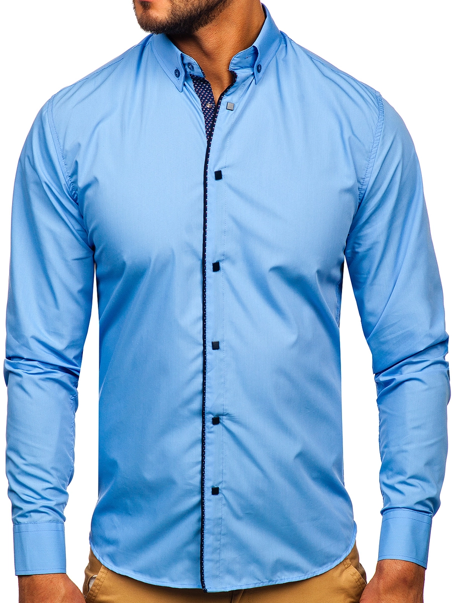 Himmelsblå långärmad skjorta med kontrasterande detaljer. Trendig, bekväm och av hög kvalitet. Den presenterade modellen från Bolf-kollektionen passar bäst tillsammans med jeans eller Chinobyxor. Den har en snygg knäppt krage. Bär dom med stil.