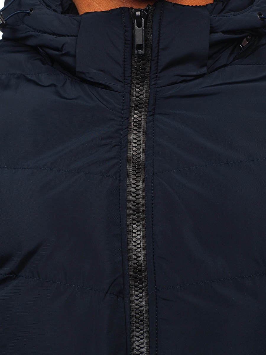 Snygg marinblå quiltad herrvinterjacka 6971 från Bolfs kollektion. Den stängs med dragkedja. Nertill och vid ärmsluten finns en mudd vilket gör att den skyddar bra mot kyla och anpassar sig bra efter kroppsformen. Den har en ståkrage och en avtagbar huva, tack vare dessa skyddar den dig bra mot vind och kyla. Det enkla snittet och passformen gör att alla får ett väldigt fördelaktigt utseende i den. Jackan har fyra praktiska fickor. Två utvändiga fickor och en ficka på höger ärm som stängs med dragkedja och tryckknappar. Det finns ytterligare en ficka invändigt. Jackan är tillverkad av material av hög kvalitet, vilket gör den väldigt mjuk och bekväm. Den består av 100% polyester. Tack vare dess mångsidighet kan den lätt matchas med många olika stilar. Perfekt för en promenad, en träff med kompisarna eller för en shoppingtur. Jackan passar perfekt till ett par chinos och en långärmad top.