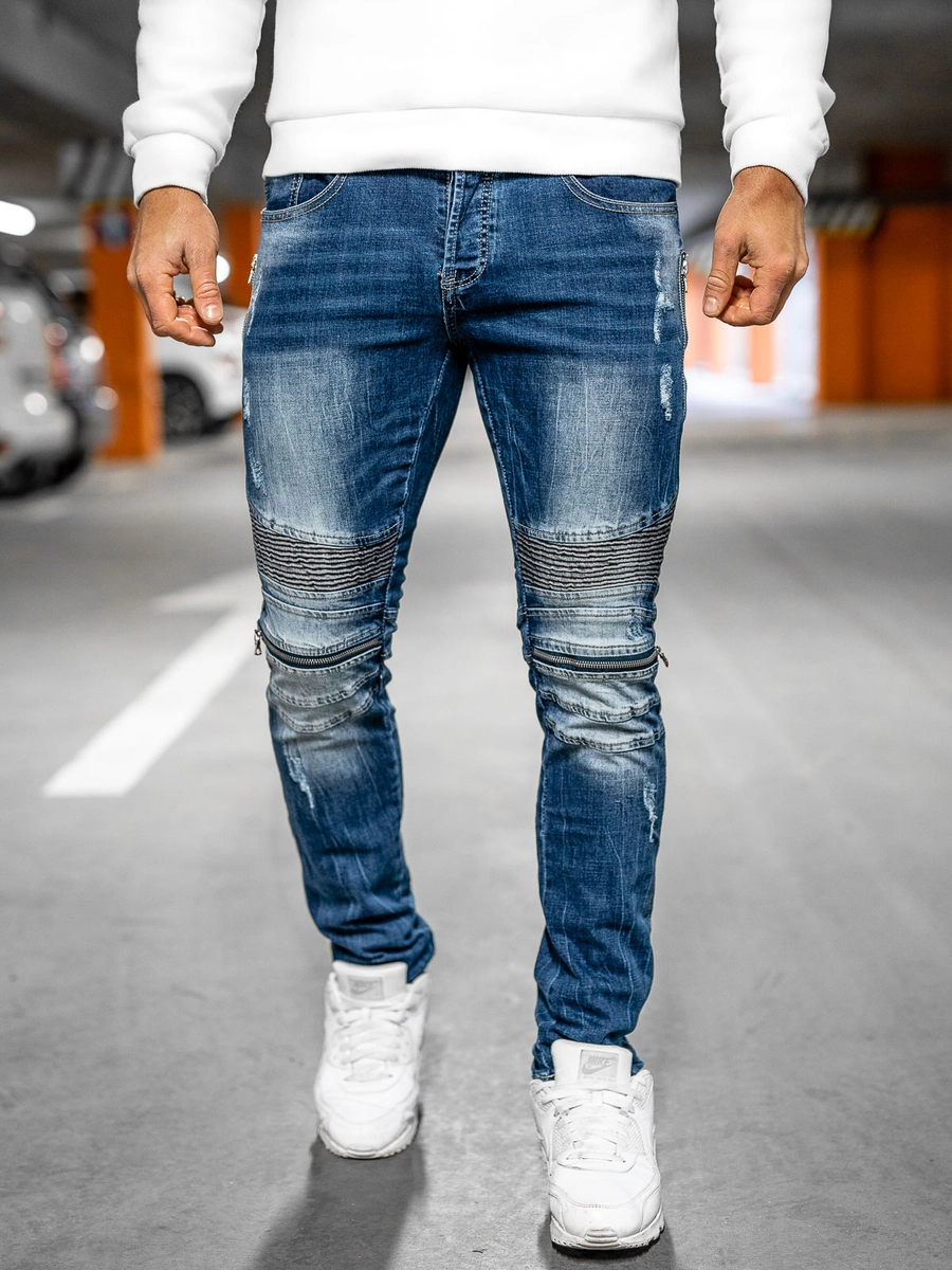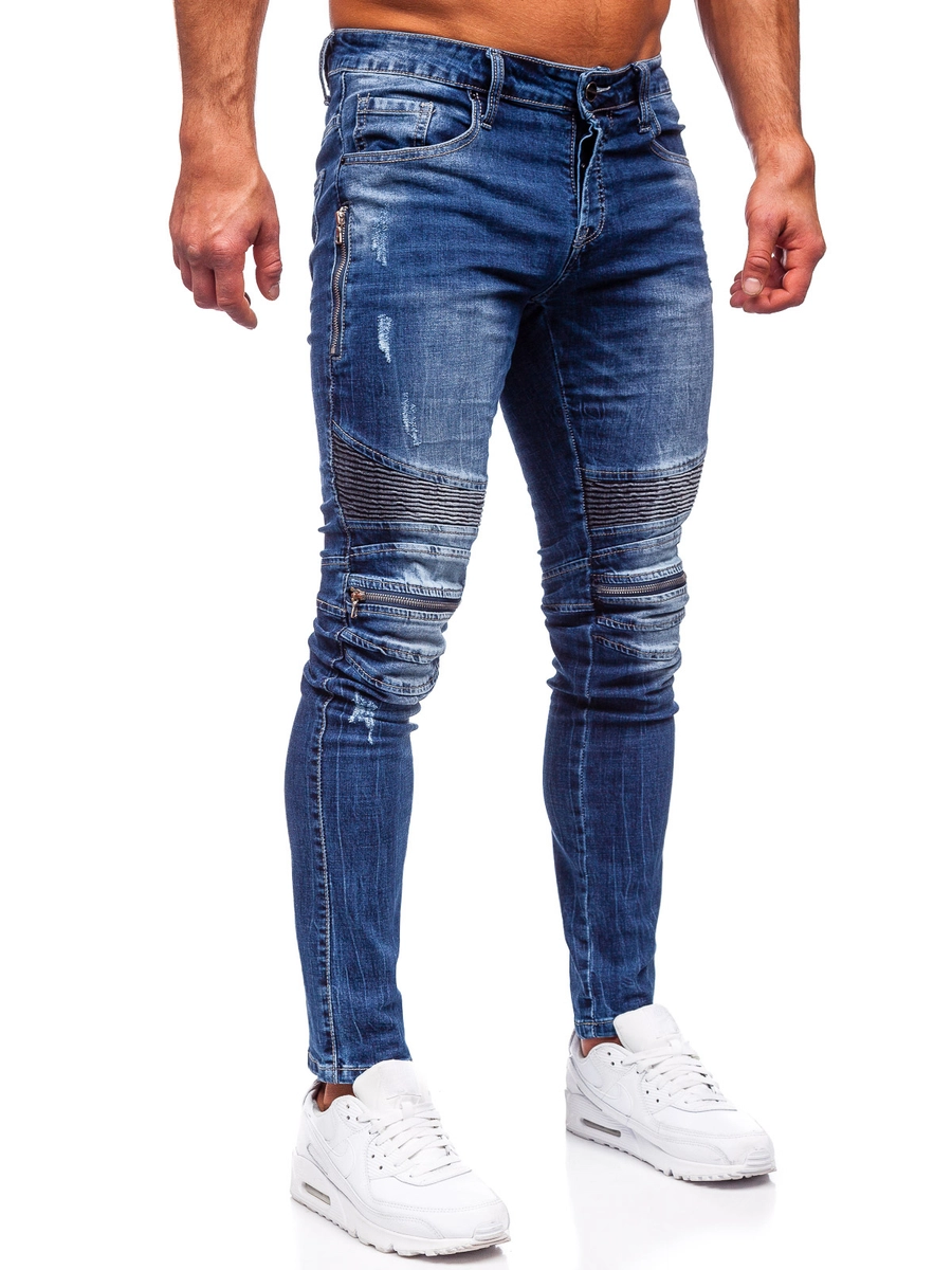 Snygga marinblå slim fit herrjeans MP007BS från Bolfs kollektion. Dessa byxor har väldigt praktiska fickor, två fram, två bak och en till liten fram. Moderiktiga skuggningar och nötningar på benen ger dem en unik look. Tack vare dekorativa applikationer på benen och imitationsfickorna med dragkedja kommer du sticka ut från mängden! De är tillverkade av 67% bomull, 29% polyester, 3% viskos och 1% elastan. Jeansbyxor är en perfekt bas för en vardaglig outfit. Du kan ha dem till skolan, på promenaden eller in till stan med kompisarna. Perfekt ihop med en T-shirt, en lättviktsjacka eller en skinnjacka. Passar perfekt för ett sportigare utseende.