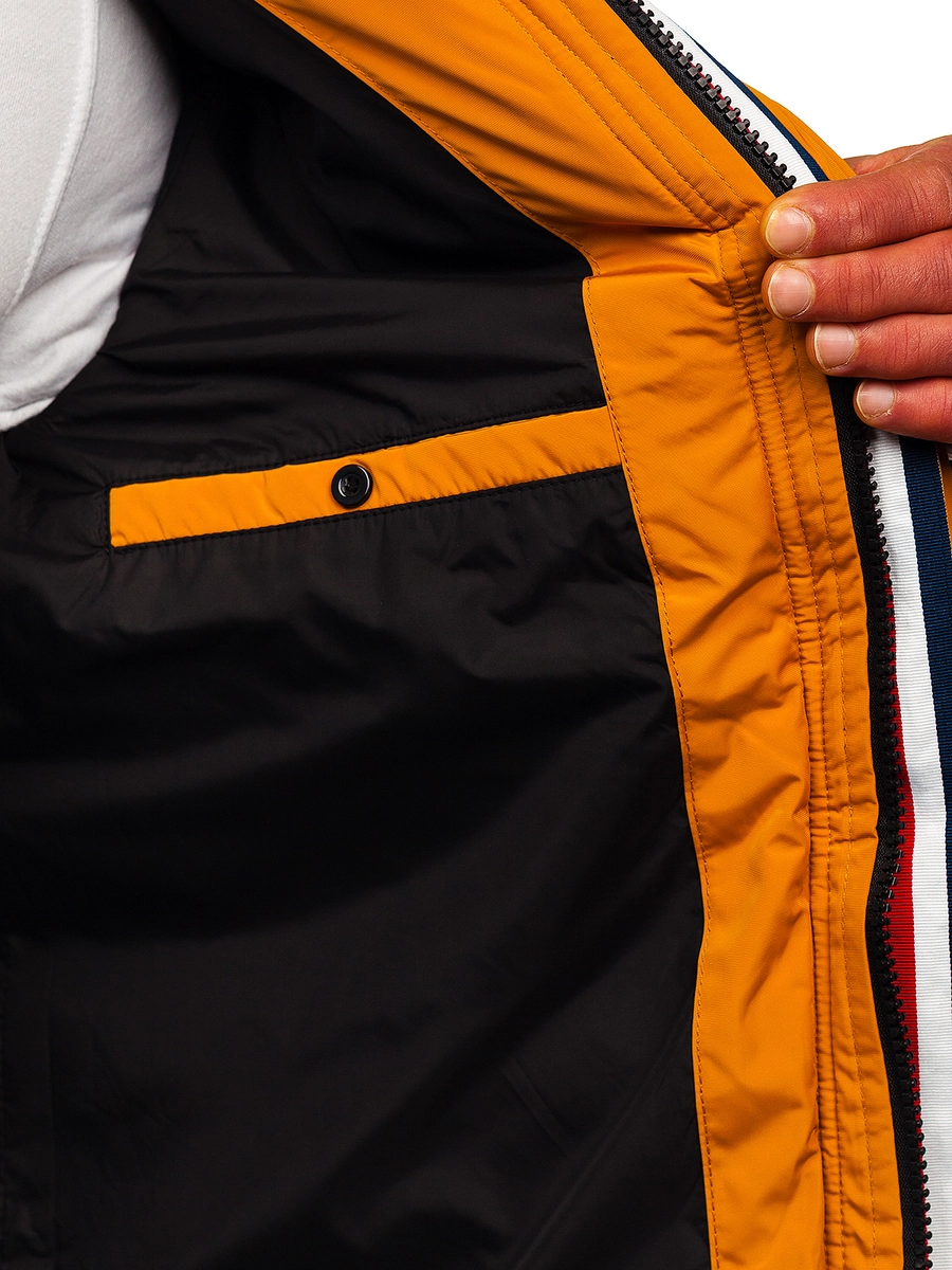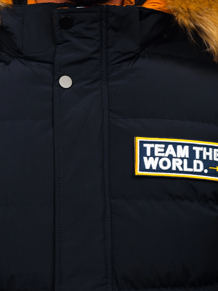 Snygg marinblå lång herrvinterjacka 6477 från Bolfs kollektion. Den stängs med dragkedja och snäppen. Ärmarna är justerbara med kardborre och har en mudd invändigt, vilket gör att jackan anpassar sig perfekt efter kroppen och skyddar bra mot kyla och vind. Den har en ståkrage och en avtagbar huva, tack vare dessa skyddar den dig bra mot vind och kyla. Det finns även en avtagbar päls på huvan. Det enkla snittet och passformen gör att alla får ett väldigt fördelaktigt utseende i den. Den får karaktär från dekorativa applikationer på bröstet och dragkedjan nertill. Den har två sidofickor med snäppe och en innerficka som stängs med knapp. Den är tillverkad av material av hög kvalitet, vilket gör den väldigt mjuk och bekväm. Perfekt för en promenad, en träff med kompisarna eller för en shoppingtur. Jackan passar perfekt med jeans och en klassisk tröja.