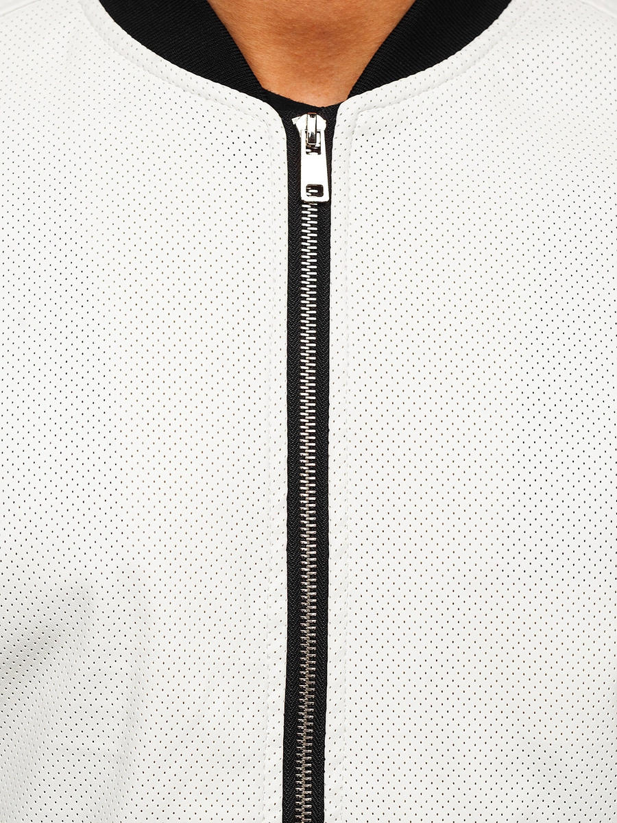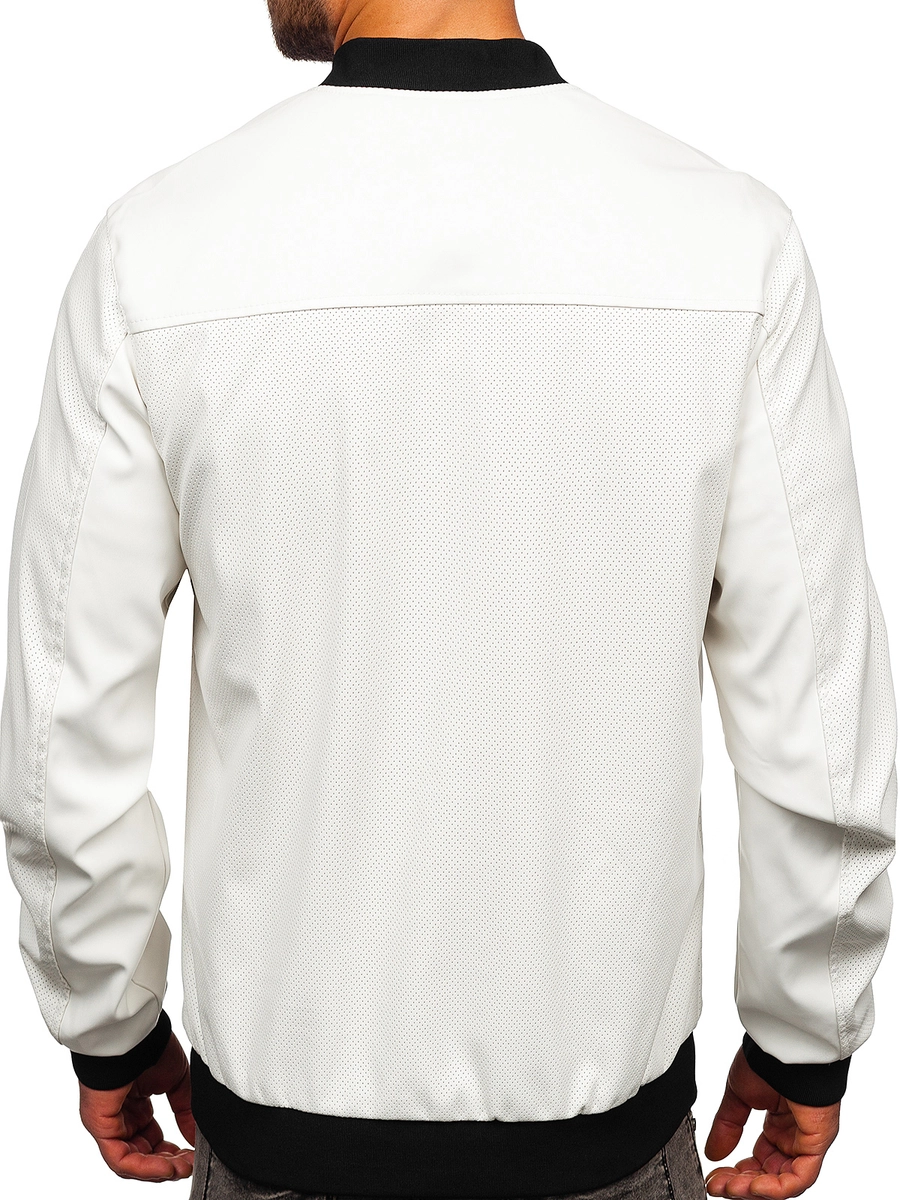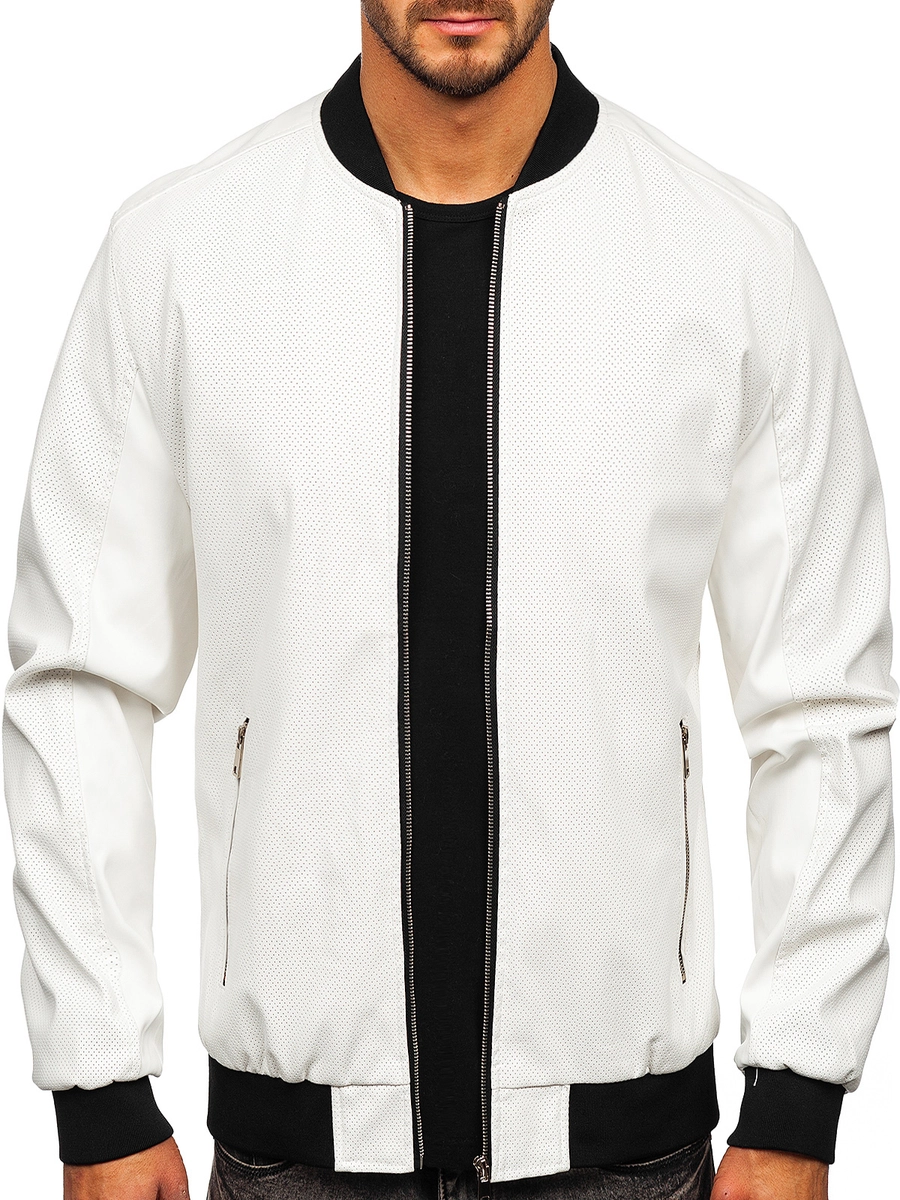 Iögonfallande vit herrskinnjacka 7110 från Bolfs kollektion. Den stängs med en dragkedja och har ståkrage med mudd. Två utvändiga fickor med dragkedjor och en innerficka ger den en praktisk karaktär. Nertill och vid ärmsluten finns en ribbning för att hålla vind och kyla ute. Skinnjackan har ett universellt snitt så den passar bra med många olika stilar och tillfällen. Den är tillverkad av två material, ekologiskt läder. Den passar bra med joggers, jeans eller lite med ledigt, till sweatpants.