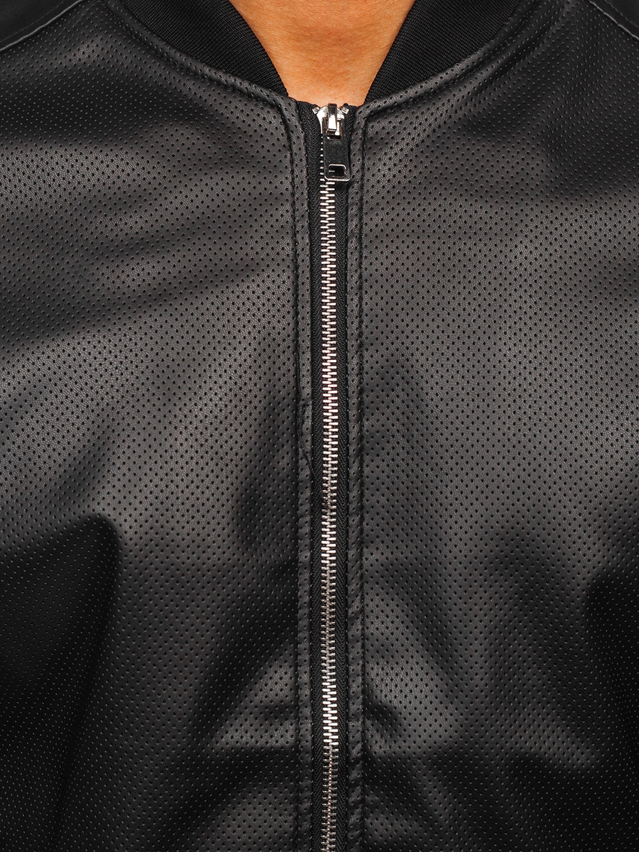 Iögonfallande svart herrskinnjacka 7110 från Bolfs kollektion. Den stängs med en dragkedja och har ståkrage med mudd. Två utvändiga fickor med dragkedjor och en innerficka ger den en praktisk karaktär. Nertill och vid ärmsluten finns en ribbning för att hålla vind och kyla ute. Skinnjackan har ett universellt snitt så den passar bra med många olika stilar och tillfällen. Den är tillverkad av två material, ekologiskt läder. Den passar bra med joggers, jeans eller lite med ledigt, till sweatpants.