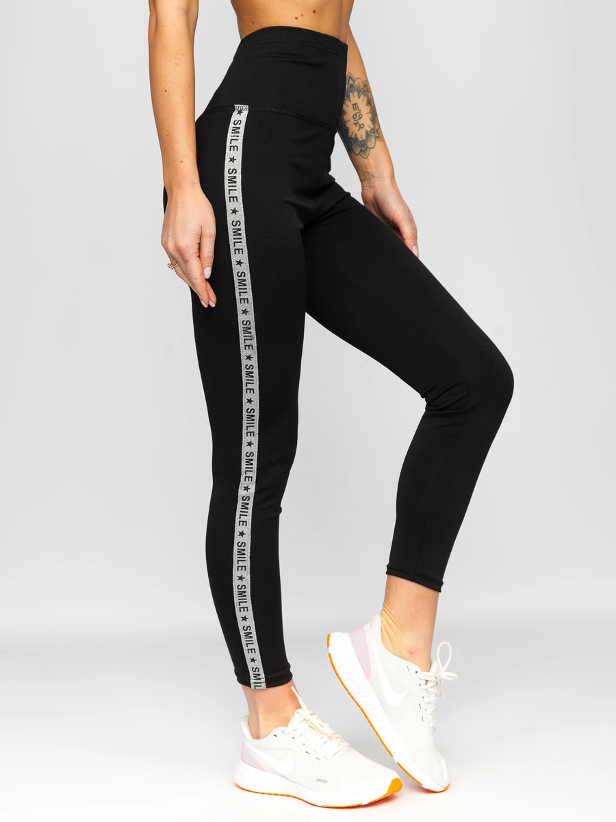 Snygga svarta damleggings TS210 från Bolfs kollektion. Tack vare att de kan justeras i midjan med en kraftig resår anpassar de sig perfekt efter kroppen. Mångsidigheten med leggings gör det möjligt att skapa många olika intressanta stilar. Den här modellen kännetecknas av snygga, dekorativa band med tryck på sidorna. Väldigt mjukt och skönt material, 94% polyester och 6% elastan ger en hög känsla av komfort. Leggings är perfekt för vardagligt bruk. Använd till snygga vardagliga eller sportiga stilar. Du kan ha dem på promenaden, till gymmet eller när du ska ut i naturen. För en sportigt stil, använd dem ihop med en T-shirt och en huvtröja med dragkedja. Till vardags kan du använda dem med en tröja och en väst.