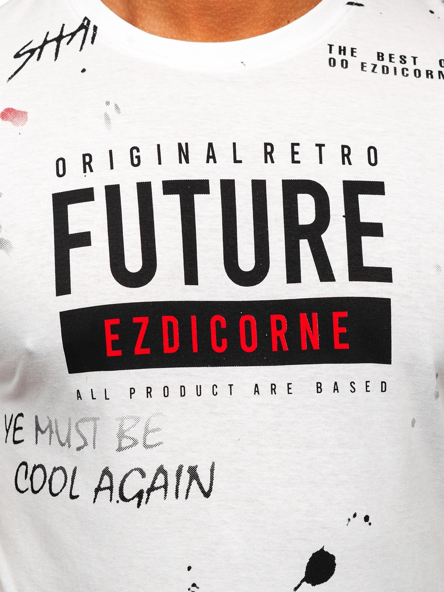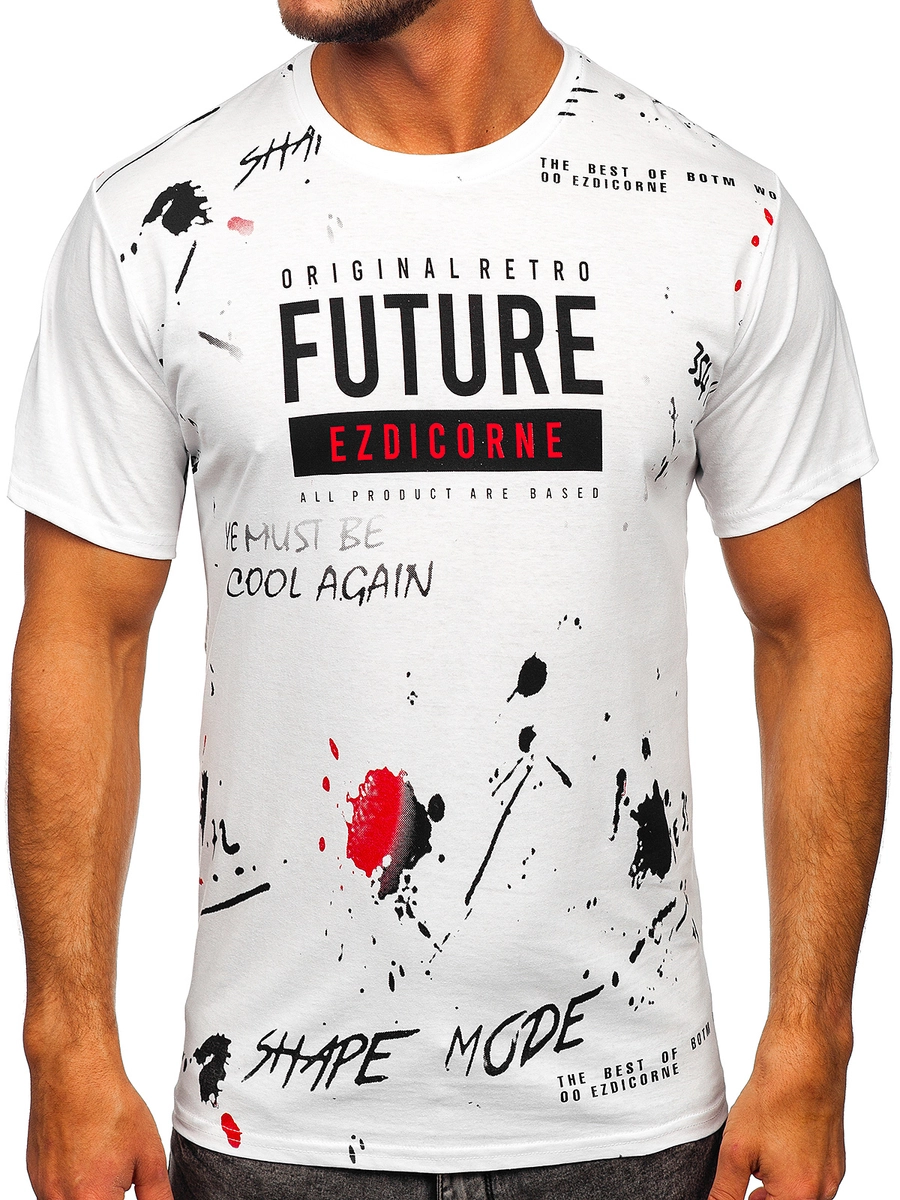 Klassisk vit herr T-shirt med tryck 14476 från Bolfs kollektion. En rak skuren T-shirt med rund halsringning passar varje figur. Tack vare de många olika färgerna kan du skapa många olika stilar med tröjan i. Den är tillverkad av 70% bomull och 30% polyester, vilket gör den väldigt mjuk och otroligt bekväm. Ett designertryck på framsidan kommer att diversifiera vilken stil som helst. Denna T-shirt är perfekt för sportiga stilar och som komplement till många olika vardagsstilar. Ska du ut med vännerna, använd ihop med shorts, en sweatshirt och en jeansjacka.