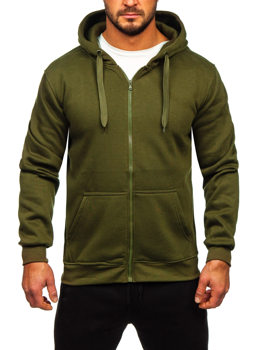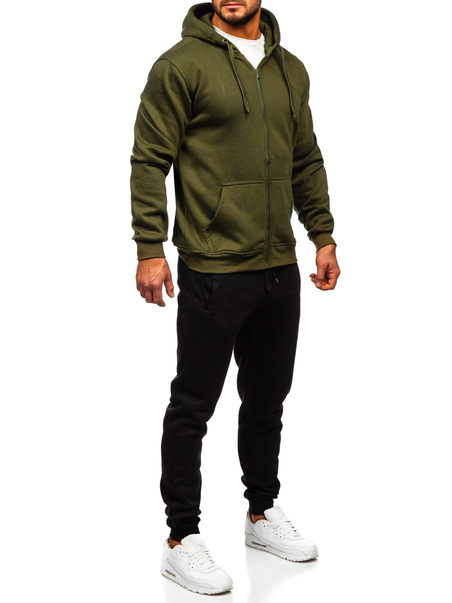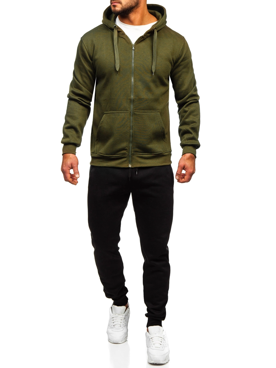 Snygg olivgrön träningsoverall med huvtröja med dragkedja D004 från Bolfs kollektion. Setet består av huvtröja och sweatpants. Det är en tröja med klassiskt snitt och som stängs med dragkedja. Den har en praktisk huva och två sidofickor. Nertill och vid ärmsluten finns en mudd vilket gör att den är varm och skyddar bra mot kyla. Byxorna är reglerbara i midjan med bred resår och dragsko och de har två fickor på sidorna. Ett enkelt snitt med bra passform ger dem ett sportigt utseende. Den är tillverkad av mjukt och skönt material för en god bekvämlighet. En träningsoverall kan vara en perfekt bas för en vardalig eller sportig outfit. Den finns i ett dussintal olika färgvarianter. Tack vare alla färger kommer du inte bara hitta en favorit, utan också färger som du lätt matchar med dina olika outfits varje dag. Setet passar perfekt med en T-shirt, en lättviktsjacka eller en sportjacka.
