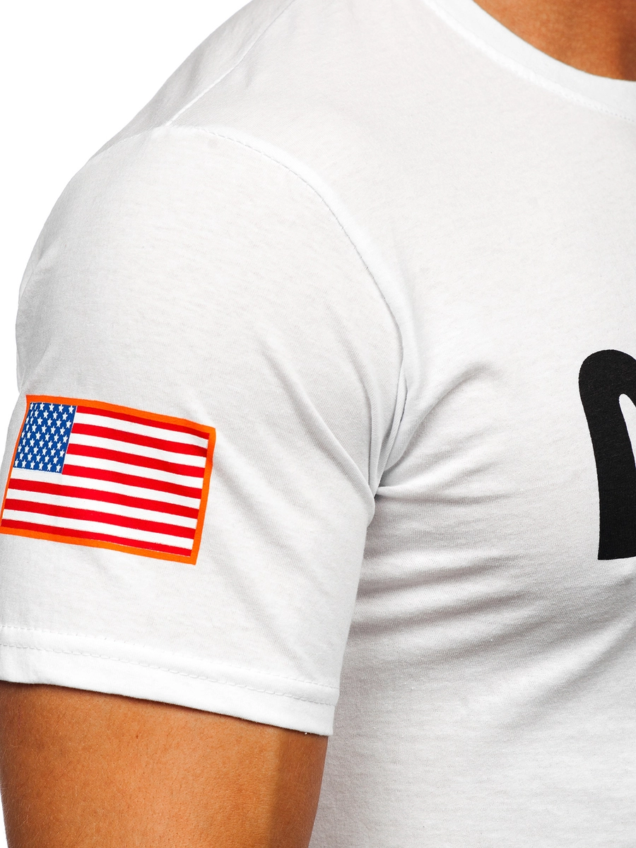 Iögonfallande vit bomulls T-shirt i med tryck 14401 från Bolfs kollektion. Den här modellen finns i två färger och har snyggt tryck som adderar karaktär åt din outfit. Den har en rund halsringning och är tillverkad av 100% bomull. Den här T-shirten är tillverkad av ett väldigt fint och mjukt material av högsta kvalitet. Den passar utmärkt till din sommaroutfit ihop med shorts och en sweatshirt.