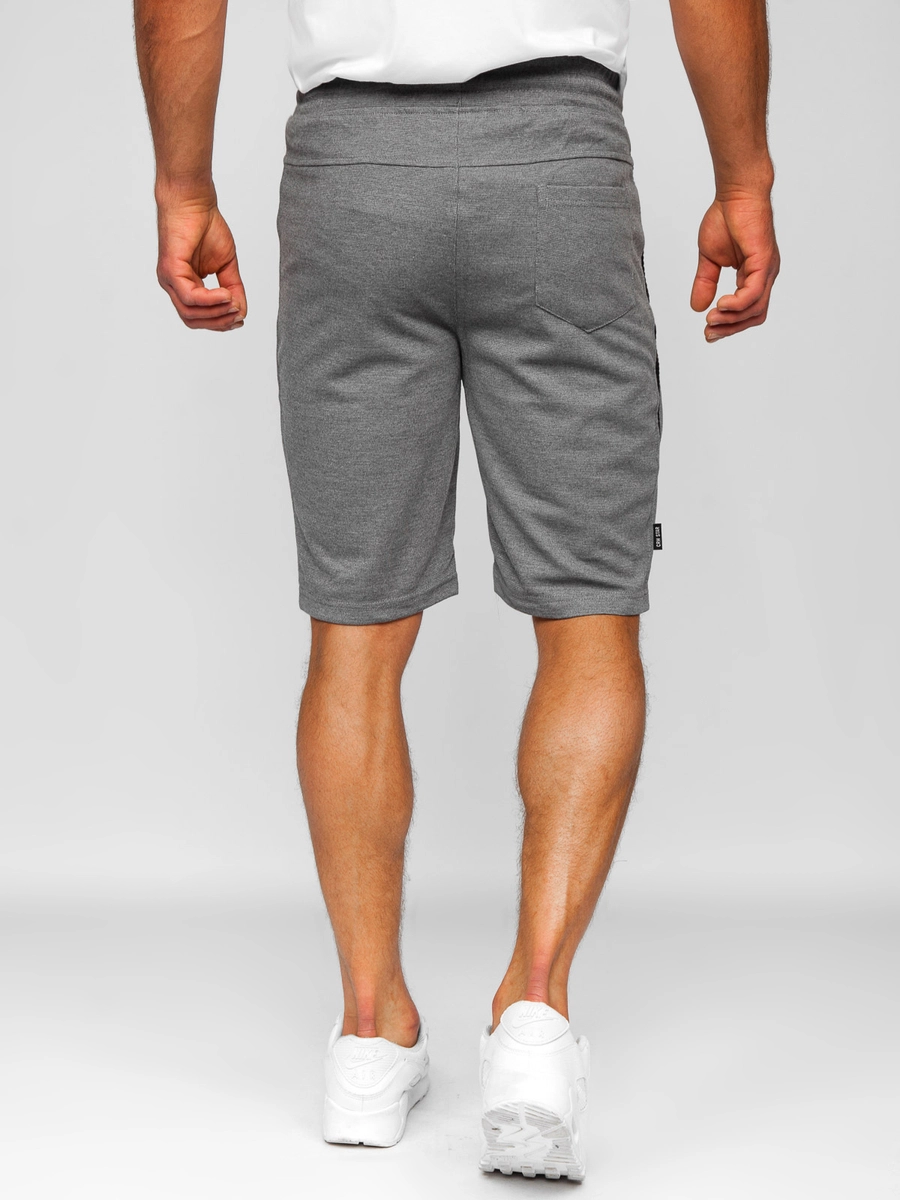 Snygga grå/svarta casual shorts från Bolfs kollektion. Använd dessa lätta och bekväma shorts på träningspasset. Den här modellen kan justeras i midjan, har två fickor med dragkedjor och textilinslag på fickorna. Passar bra med en T-shirt och sneakers.