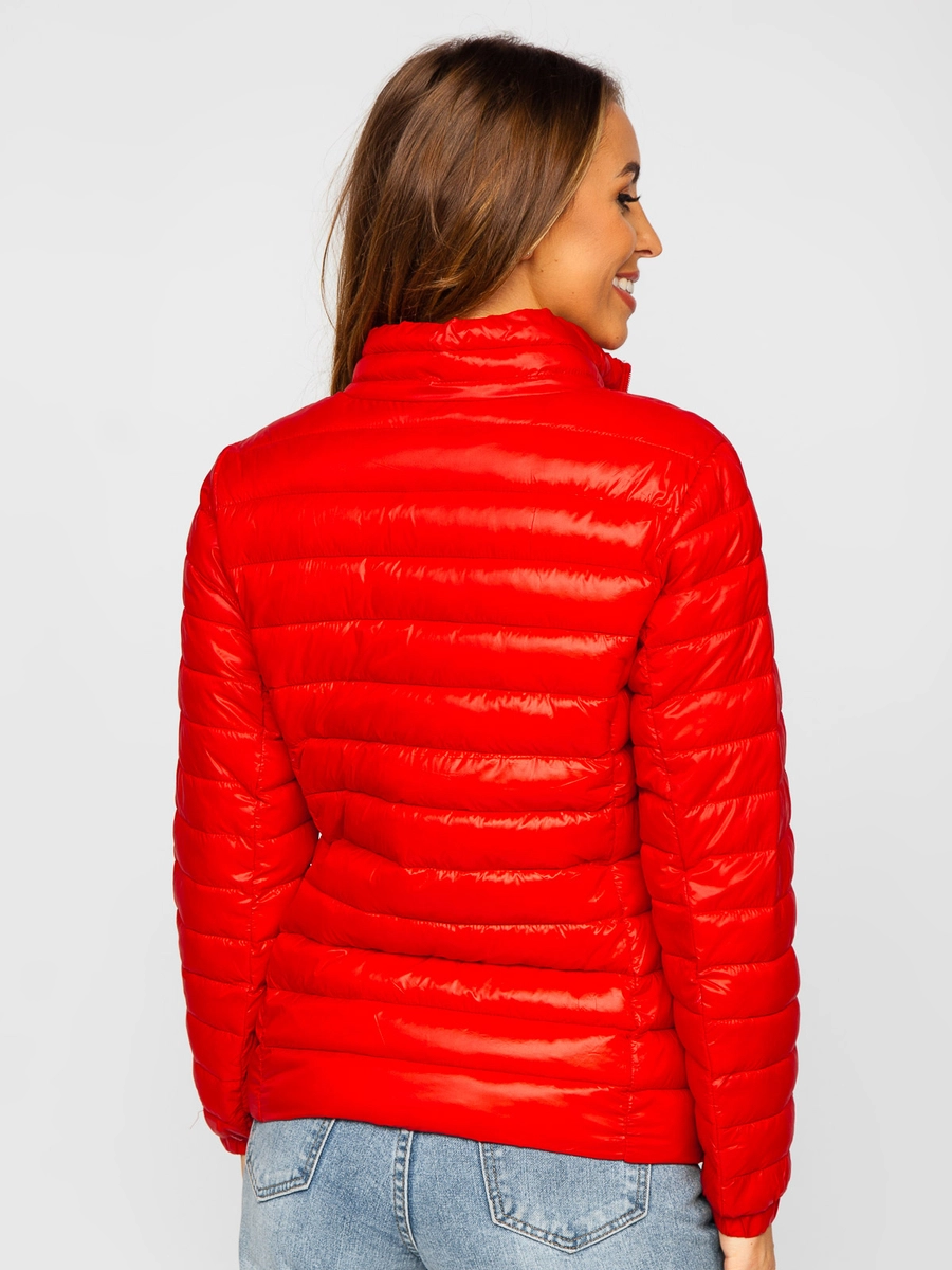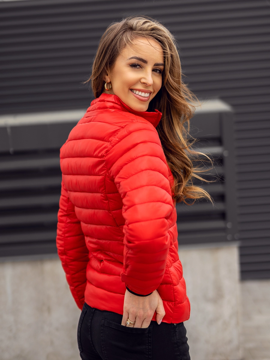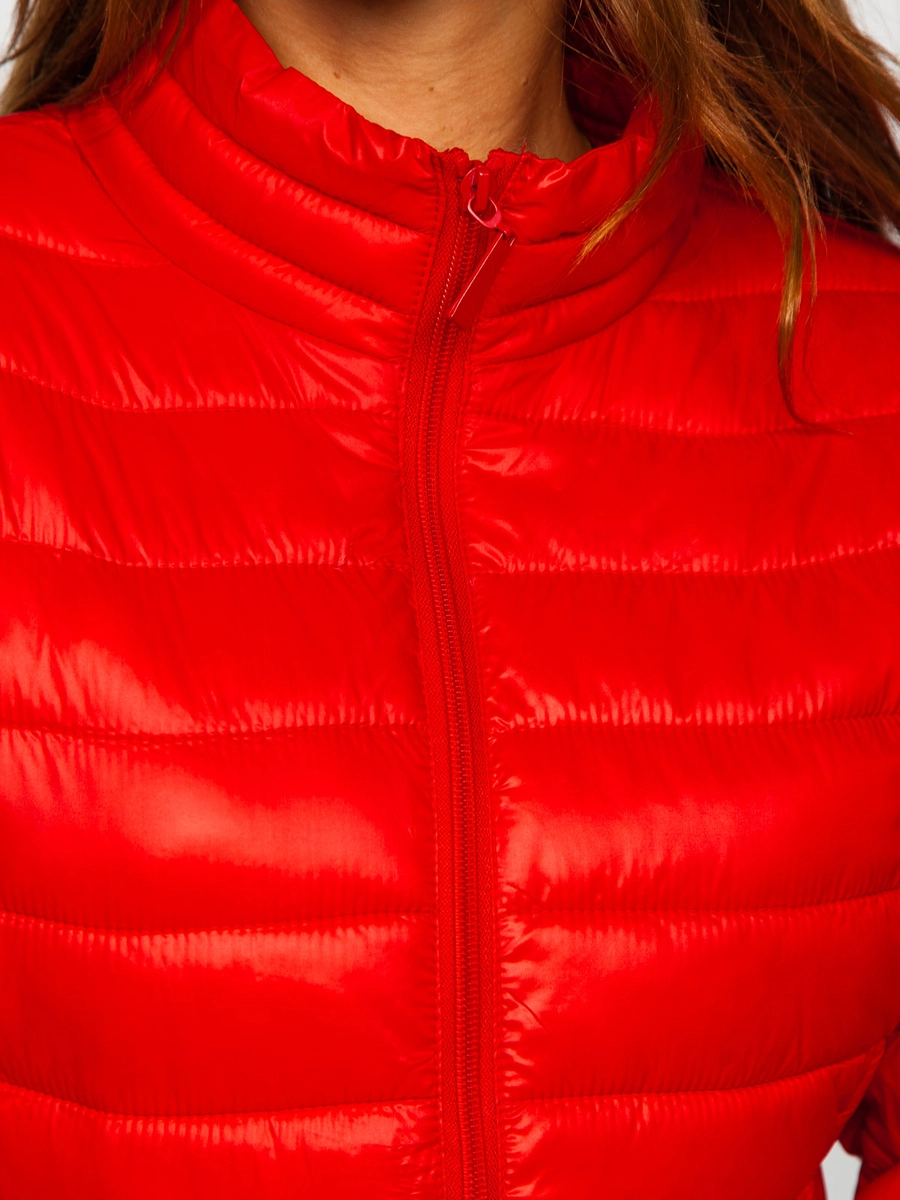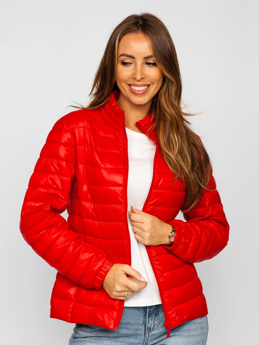 Snygg röd quiltad damlättviktsjacka 5M706. Den quiltade jackan stängs med en dragkedja och har en ståkrage. Den är vadderad för att ge den en sportig stil. Jackan är utrustad med en ståkrage. Två utvändiga fickor med dragkedjor ger en praktisk karaktär. Tack vare material av högsta kvalitet är produkten mycket bekväm, sitter perfekt på kroppen och är behaglig. Den kan framgångsrikt ersätta en sweatshirt som ger skydd mot kyla och vind. Den kommer att se bra ut i kombination med träningsbyxor för att skapa en sportig, lös outfit!