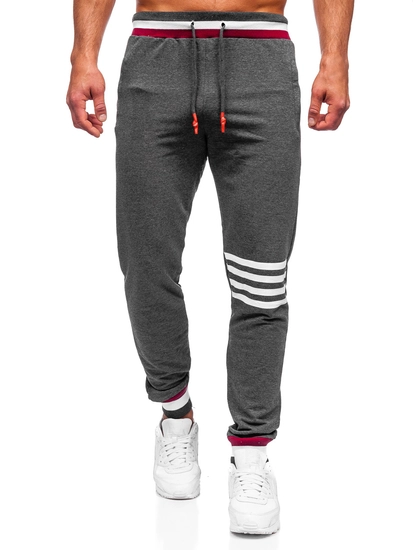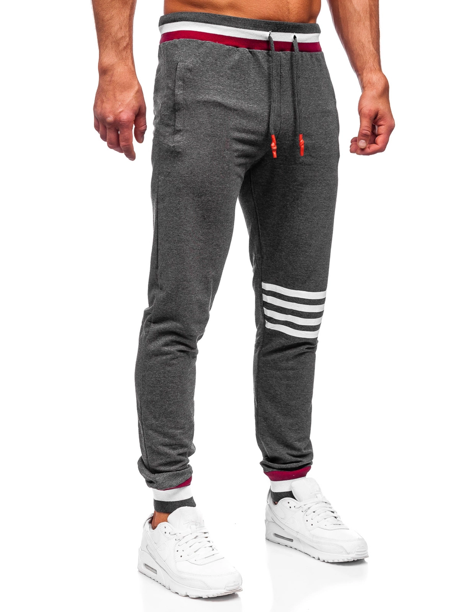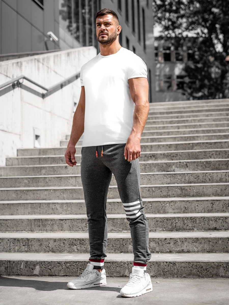 Klassiska grafitgrå herrsweatpants 7033 från Bolfs kollektion. Tack vare att de kan justeras i midjan med en kraftig resår och dragsko anpassar de sig perfekt efter kroppen. Det är muddar med snygga ränder på benen. Byxorna har två sidofickor med dragkedja. Du kan ha dem på promenaden, till gymmet eller när du ska träffa kompisarna på en bar. De är perfekta för en spontan tur till stan. Skapa din sportiga outfit ihop med en T-shirt, en sweatshirt och en väst.