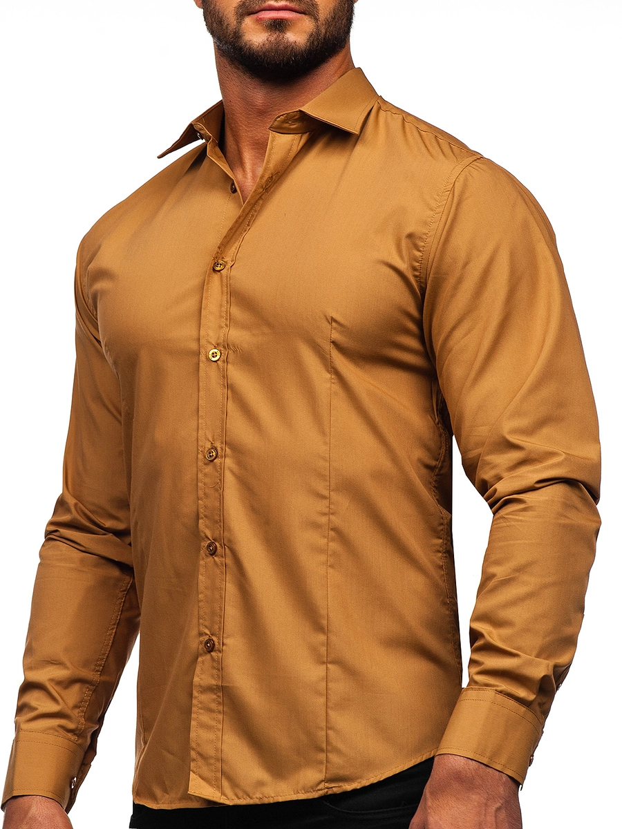 Elegant ljusbrun långärmad herrskjorta 1703 från Bolfs Kollektion. Den här modellen finns i flera olika färger. Enfärgade herrskjortor rekommenderas till de som gillar minimalism och klassisk elegans i modet. Den är bekväm och har bra passform. Defenitivt ett måste i den medvetna affärsmannens garderob. Designen är rak och passar till olika stilar. Skjortan är av slim fit-modell, har knappar och är praktiskt rundad nertill. Ärmarns avslutas med en bred, justerbar manschett som stängs med en knapp. Den har en klassisk krage med korta slag. Den kommer helt säkert uppfylla alla dina förväntningar oavsett vilken färg du väljer. Välj bland många fina färger. Skjortor passar i många olika formella och halvformella sammanhang. Affärsmöte? Date? Fest? För vart och ett av dessa tillfällen passar en enfärgad skjorta från Bolf. Den här modellen passar bra med jeans, joggers, en bomberjacka eller en klassisk skinnjacka. Använd gärna med chinos, en kavaj eller en kostym. Lägg till en klassisk fluga eller en slips. Skjortan Bolf 1703 är märkets flaggskepps-produkt. Den är också en av Bolfs försäljningssuccéer, i åratal har den varit bland de 10 bästa shoppingvalen för våra kunder som är villiga att komma tillbaka för nya färgversioner av produkten. Exceptionellt bra pris och bra utförande är andra fördelar med skjortan.