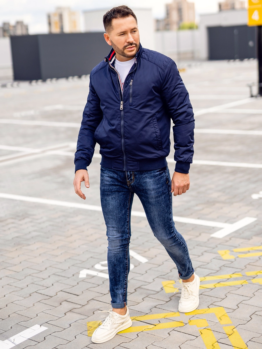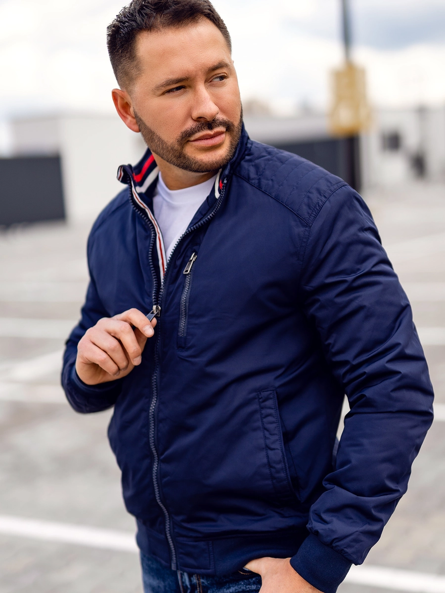 Fin marinblå herrlättviktsjacka från Bolfs kollektion. Den är kort, moderiktig, bekväm och oersättlig under övergångsperioden. Modellen understryker fint silhuetten och passar till en streetwearstil. Använd med ett par joggers, jeans och en snygg T-shirt.