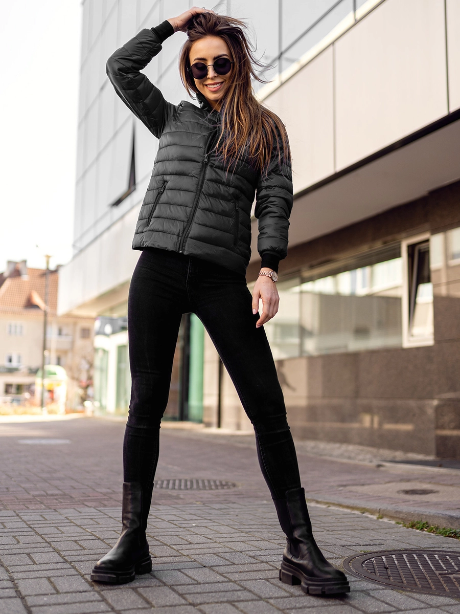 Snygg svart quiltad lättviktsjacka 1141A från Bolfs kollektion. En quiltad jacka kommer att tillföra unikhet till din garderob. Den stängs med en dragkedja och har en huva fäst i ståkragen. En praktisk detalj är två ytterfickor som stängs med dragkedja. Jackans form är rak och ärmarna har en elastisk mudd nertill. Den passar den som vill ha en vardaglig stil. Perfekt för en promenad eller för en shoppingtur. Den är tillverkad av 100 % nylon vilket gör den flexibel. Den passar perfekt med jeans.