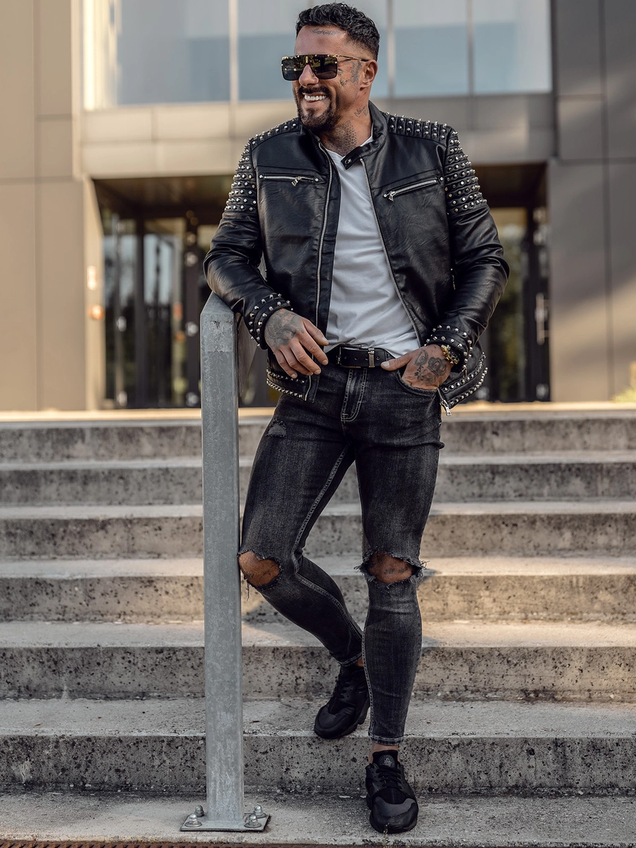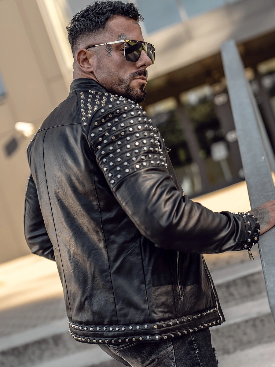 Snygg svart herr skinnjacka med dubbar 11Z8007 från Bolfs kollektion. Den stängs med en dragkedja och har en ståkrage. Denna megafashionabla skinnjacka är dekorerad med dubbar och ärmarna är färdiga med en dekorativ dragkedja, tack vare vilken den definitivt kommer att få dig att sticka ut från mängden! Det enkla snittet och passformen gör att alla får ett väldigt fördelaktigt utseende i den. Den har praktiska fickor: två sidfickor och två bröstfickor med dragkedjor. Den har även en invändig ficka utan stängning. Tack vare dess mångsidighet kan den lätt matchas med många olika stilar. Det kommer att skapa en perfekt kombination med både jeans, träningsoveraller eller chinos.
