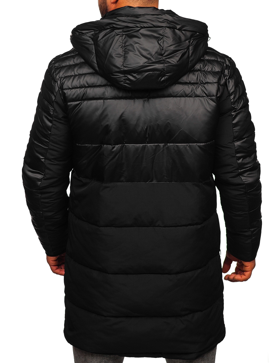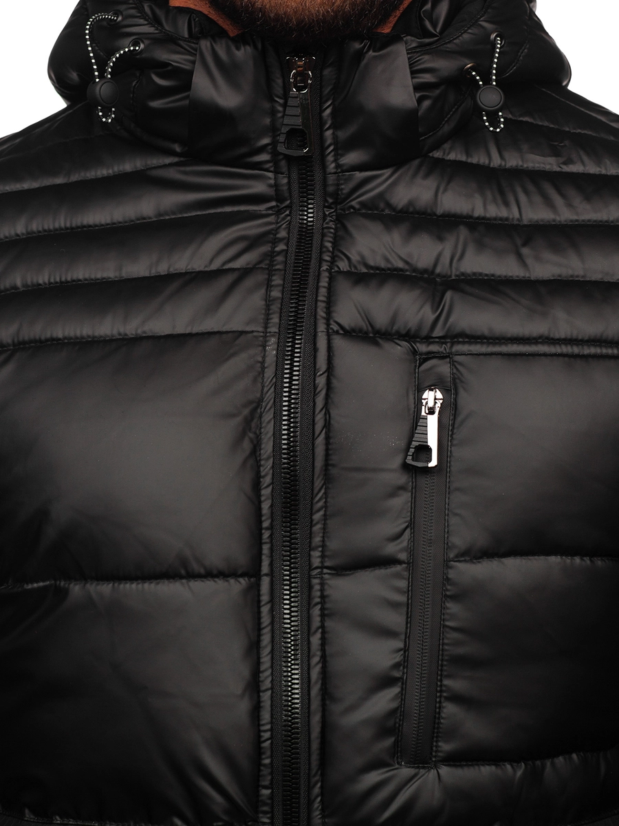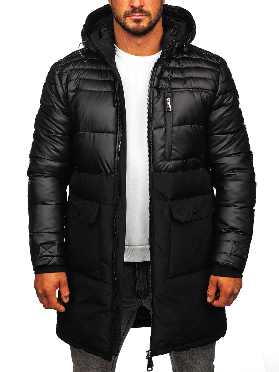 Snygg svart långlinje quiltad herrvinterjacka 22M62 från Bolfs kollektion. Den har dragkedjestängning. Den har en avtagbar, justerbar huva samt en ståkrage. Den här modellen har praktiska fickor där du kan bära med dig de viktigaste sakerna. Sidofickor knäpps med tryckknapp och bröstfickan knäpps med dragkedja. Det finns ytterligare två fickor inuti, en av dem har dragkedja. Jackan anpassar sig perfekt till figuren tack vare ärmarna som är avslutade med en passform, justerbar med kardborreband. Den enkla stilen gör det möjligt att skapa många olika outfits. Matcha den trendiga quiltade jackan med jeans, en T-shirt och en tröja!