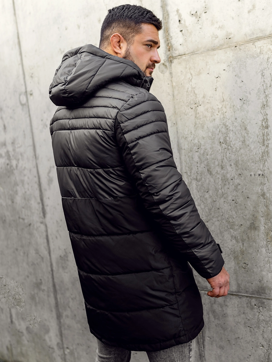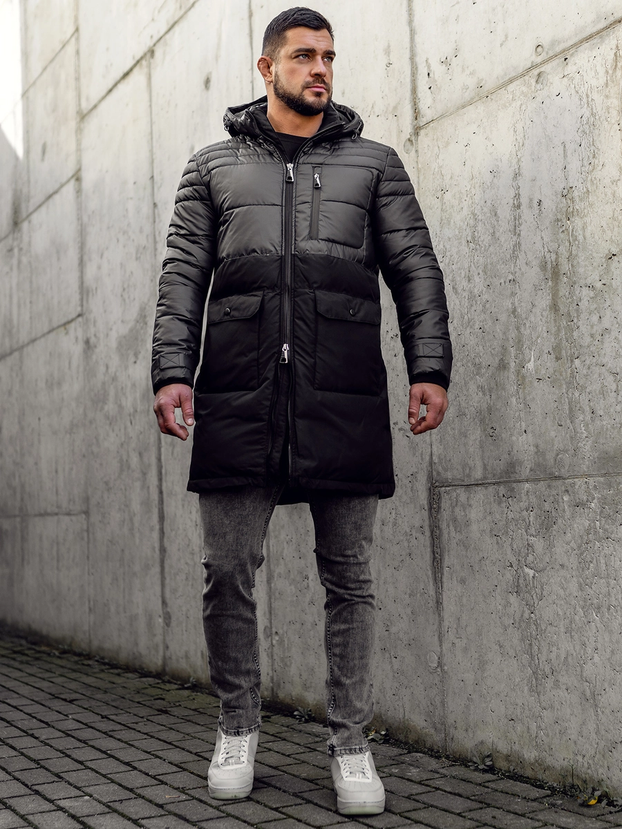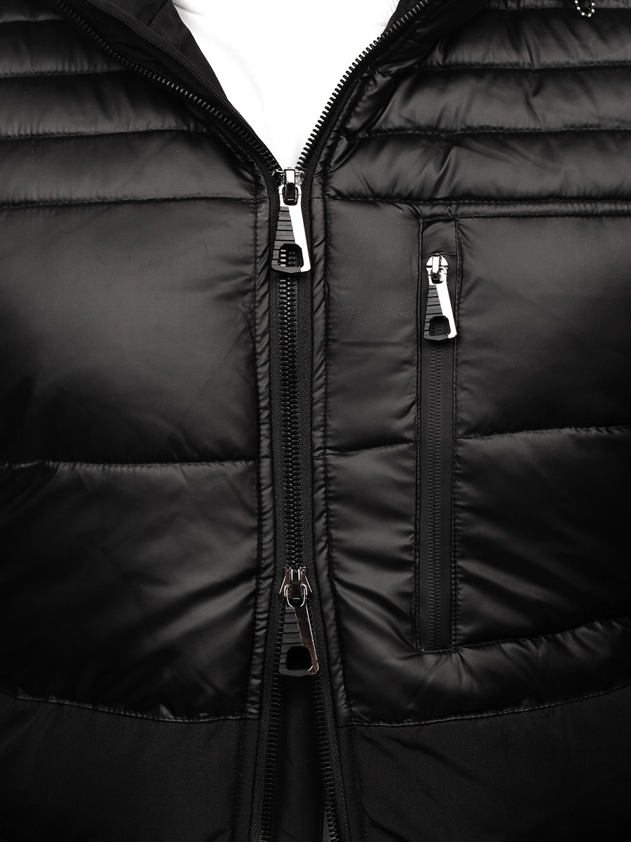 Snygg svart långlinje quiltad herrvinterjacka 22M62 från Bolfs kollektion. Den har dragkedjestängning. Den har en avtagbar, justerbar huva samt en ståkrage. Den här modellen har praktiska fickor där du kan bära med dig de viktigaste sakerna. Sidofickor knäpps med tryckknapp och bröstfickan knäpps med dragkedja. Det finns ytterligare två fickor inuti, en av dem har dragkedja. Jackan anpassar sig perfekt till figuren tack vare ärmarna som är avslutade med en passform, justerbar med kardborreband. Den enkla stilen gör det möjligt att skapa många olika outfits. Matcha den trendiga quiltade jackan med jeans, en T-shirt och en tröja!