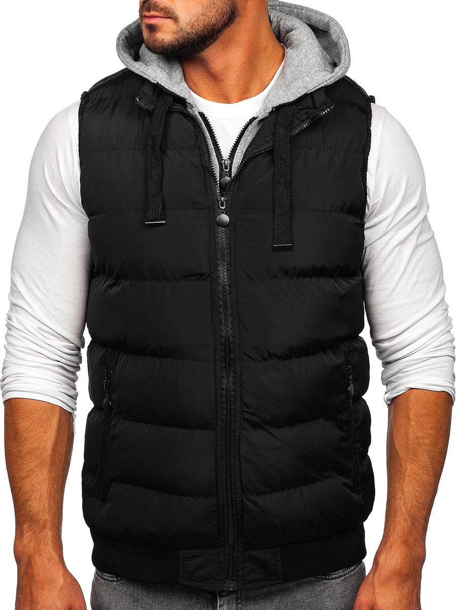 Snygg svart quiltad herrväst med huva 5M751 från Bolfs kollektion. Västen knäpps med dragkedja, har en ståkrage. Två ytterfickor med dragkedjor och en innerficka ger den en praktisk karaktär. Botten avslutad med en passform säkerställer en perfekt passform av västen till kroppen. Ett extremt moderiktigt och praktiskt element är också ett inlägg som imiterar en sweatshirt med justerbar huva. Västen finns i flera moderiktiga färger. Sportigt, enkelt snitt är perfekt för alla aktiviteter eller fjällturer. Få en moderiktig outfit genom att kombinera en väst med en tröja och jeans.