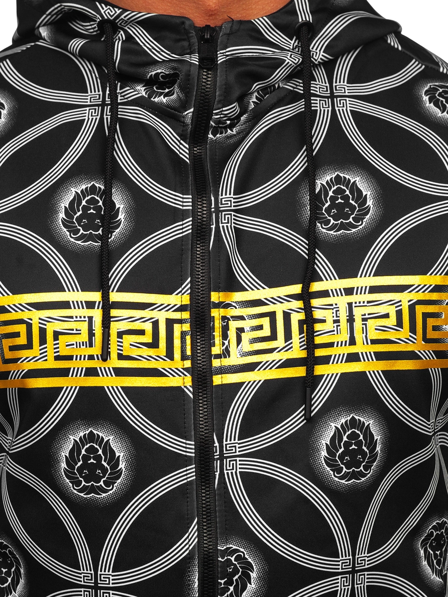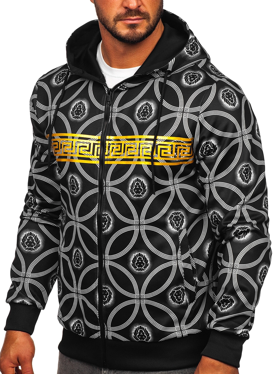 Snygg svart herrhuvtröja med dragkedja 27B8123 från Bolfs kollektion. En sweatshirt med klassiskt snitt med justerbar huva kommer att vara perfekt för fans av en sportig stil. Ett designertryck ger den en unik fashionabel karaktär. Nertill och vid ärmsluten finns en mudd vilket gör att den är varm och skyddar bra mot kyla. Tröjan har två sidfickor. Den är gjord av ett mycket behagligt material som garanterar komfort även under den mest krävande träningen. Letar du efter en sportoutfit? Matcha sweatshirten med träningsbyxor, en T-shirt och en gilet!