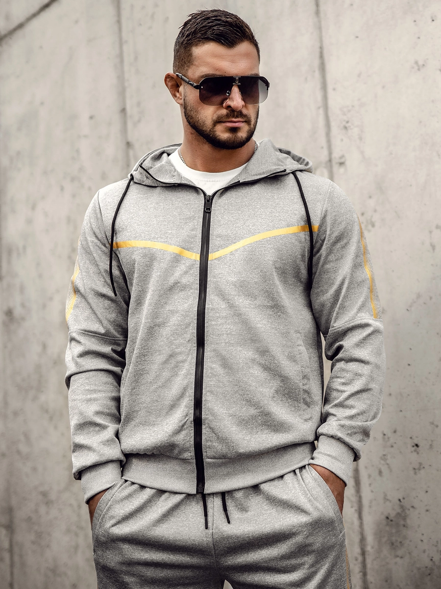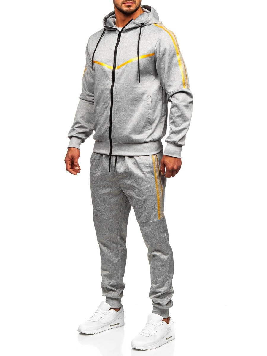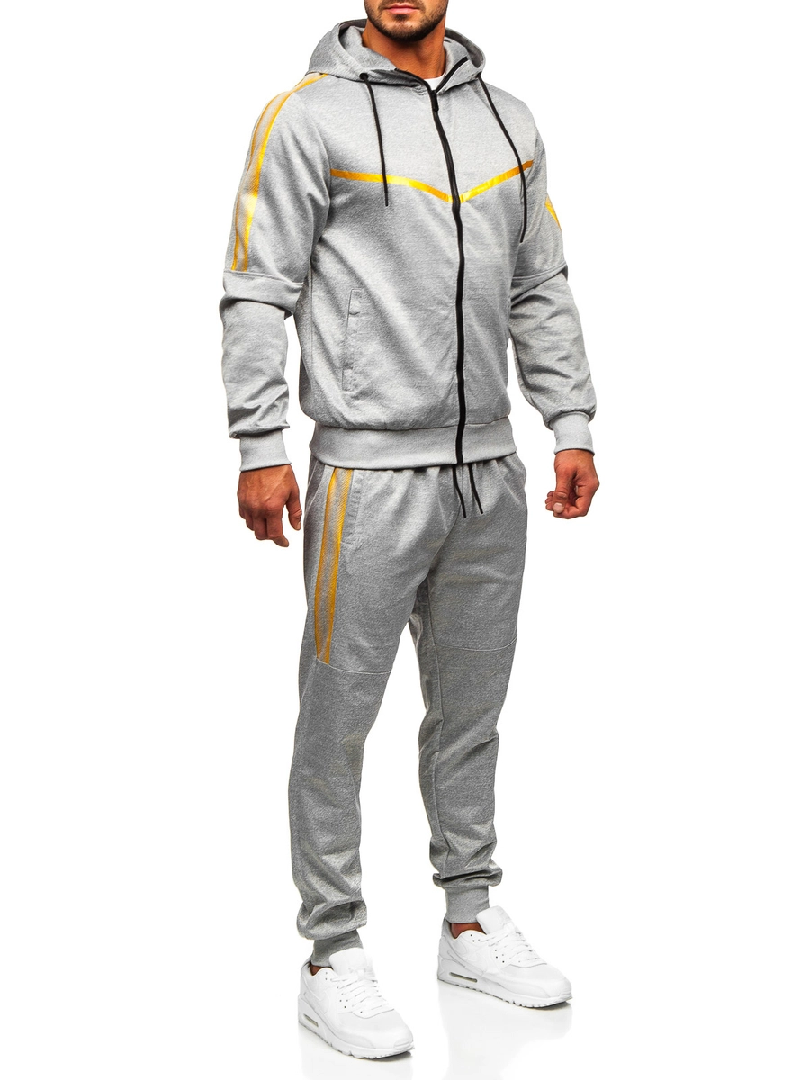 Snygg grå träningsoverall med huvtröja med huva 27C8117 från Bolfs kollektion. Setet består av huvtröja och sweatpants. Tröjan har en justerbar huva, ståkrage och två ytterfickor. Byxorna är reglerbara i midjan med bred resår och dragsko och de har två fickor på sidorna. Ett enkelt snitt med bra passform ger dem ett sportigt utseende. Fashionabla tryck på både sweatshirten och byxorna ger dig karaktär och får dig att sticka ut på gymmet! Den är tillverkad av mjukt och skönt material för en god bekvämlighet. Både tröjan och byxorna kan kombineras med olika kläder, vilket gör dem väldigt användbara i dina vardagliga outfits. Setet kommer perfekt att matcha en T-shirt och en väst.