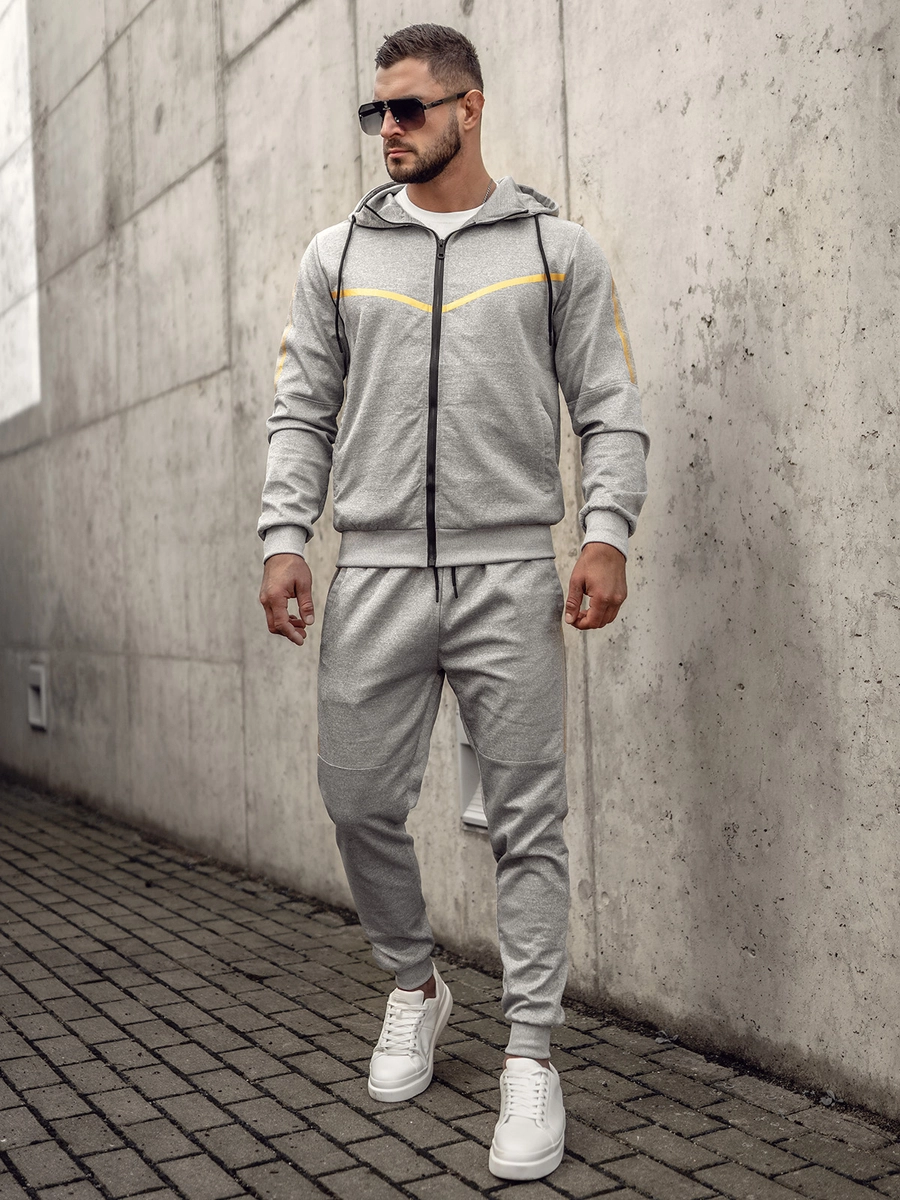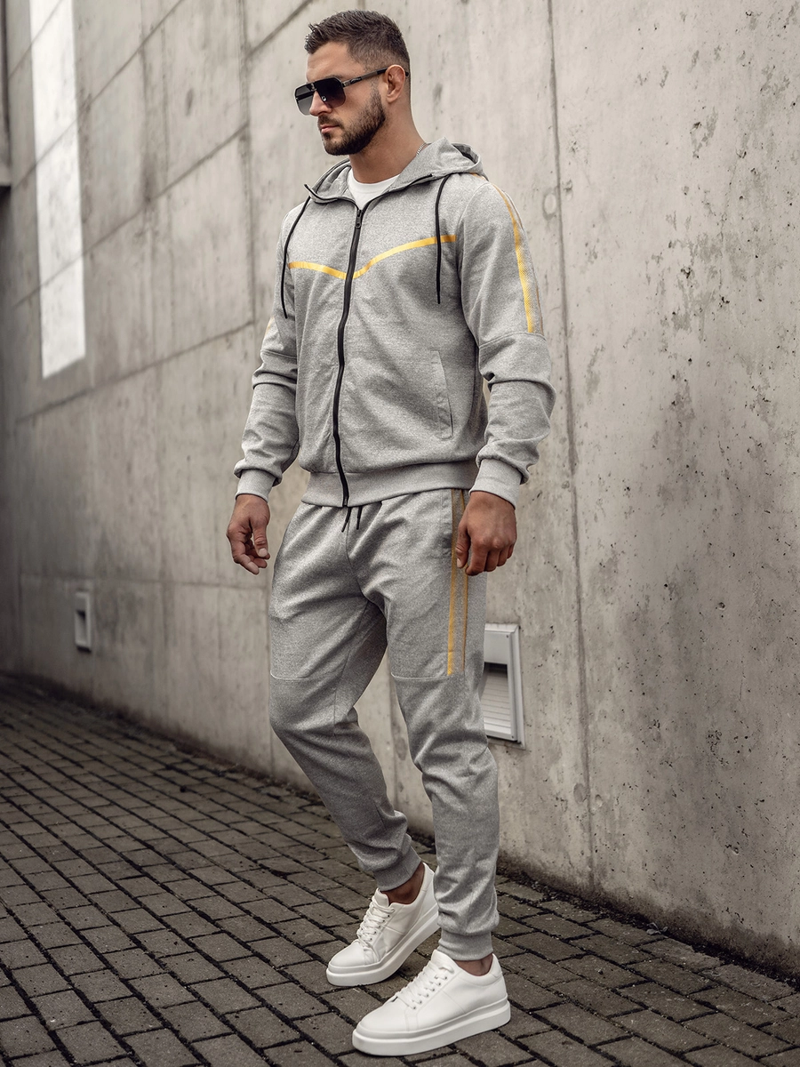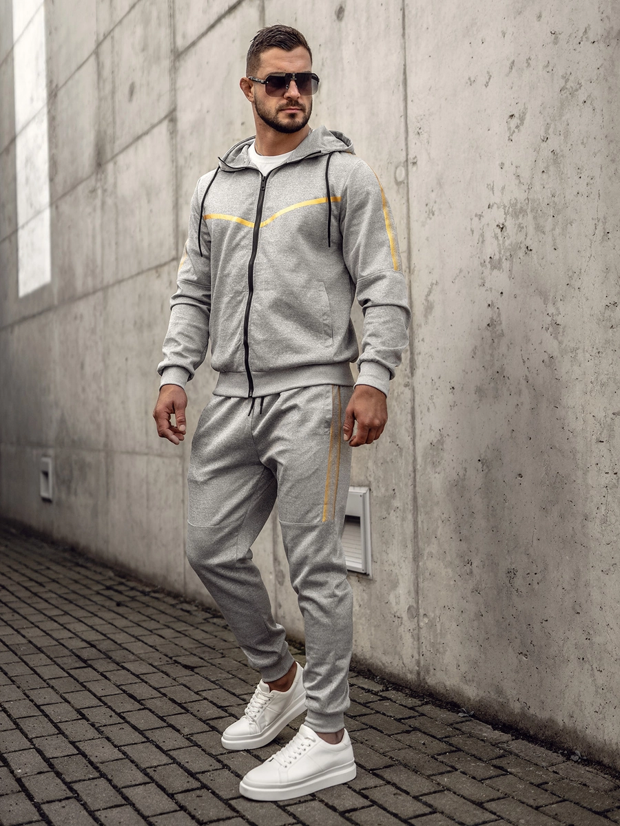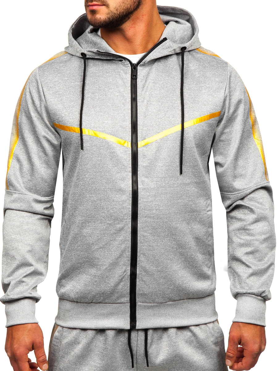 Snygg grå träningsoverall med huvtröja med huva 27C8117 från Bolfs kollektion. Setet består av huvtröja och sweatpants. Tröjan har en justerbar huva, ståkrage och två ytterfickor. Byxorna är reglerbara i midjan med bred resår och dragsko och de har två fickor på sidorna. Ett enkelt snitt med bra passform ger dem ett sportigt utseende. Fashionabla tryck på både sweatshirten och byxorna ger dig karaktär och får dig att sticka ut på gymmet! Den är tillverkad av mjukt och skönt material för en god bekvämlighet. Både tröjan och byxorna kan kombineras med olika kläder, vilket gör dem väldigt användbara i dina vardagliga outfits. Setet kommer perfekt att matcha en T-shirt och en väst.
