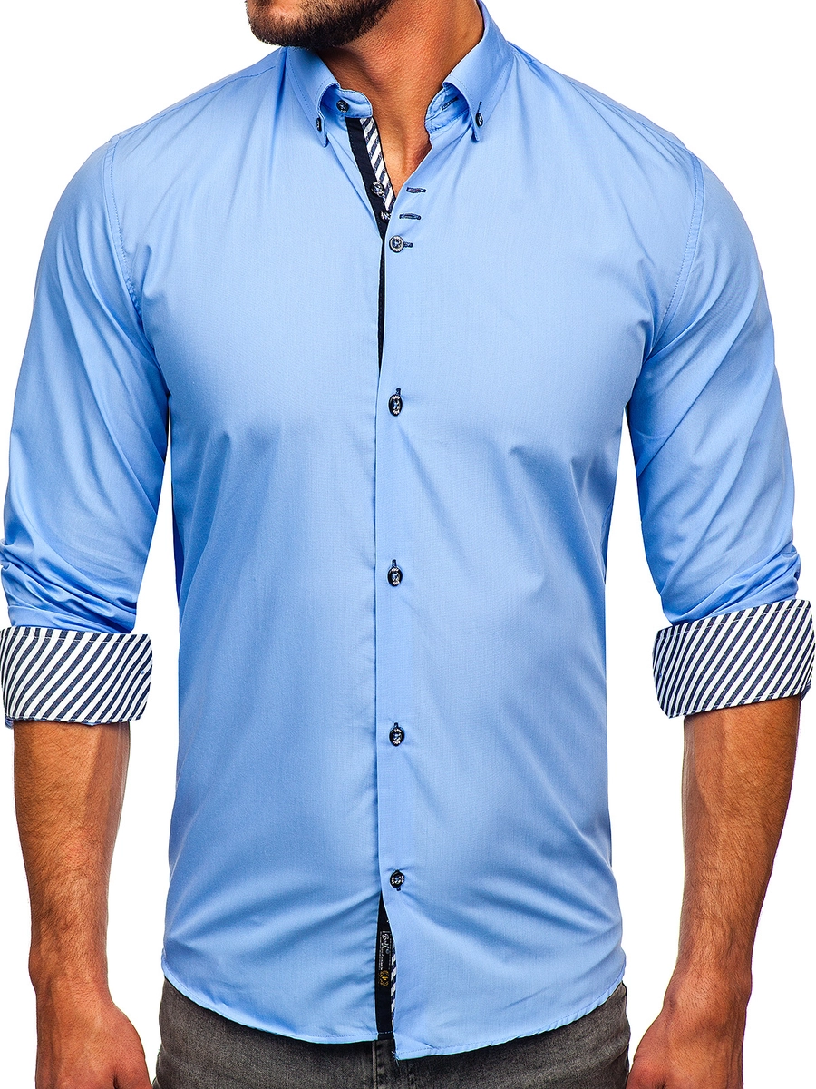 Elegant blå herrskjorta från Bolfs kollektion. Den är lätt och har skön passform. Modellen är slim fit och passar bra ihop med jeans. Passar bra med ett par chinos och en kavaj.