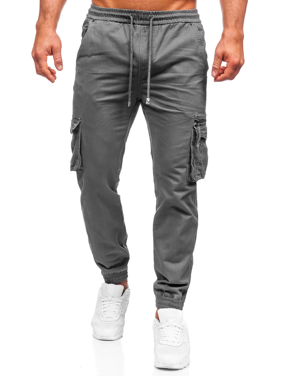 Snygga grafitgrå herrcargojoggers MP0181G från Bolfs kollektion. Tack vare att de kan justeras i midjan med en kraftig resår och dragsko anpassar de sig perfekt efter kroppen. De har klassiska fickor framtill, bakfickor med knapp och sidfickor med lock som knäpps med knapp. Det dekorativa elementet är en fashionabel imitation av en ficka med dragkedja. Nertill finns en mudd som skyddar inte bara ser bra ut, den skyddar även bra mot kyla och vind. De är gjorda av 100% bomull. Tack vare material av högsta kvalitet kommer du att känna dig bekväm att bära dem. Joggare kommer att se bra ut med en T-shirt och en tröja.