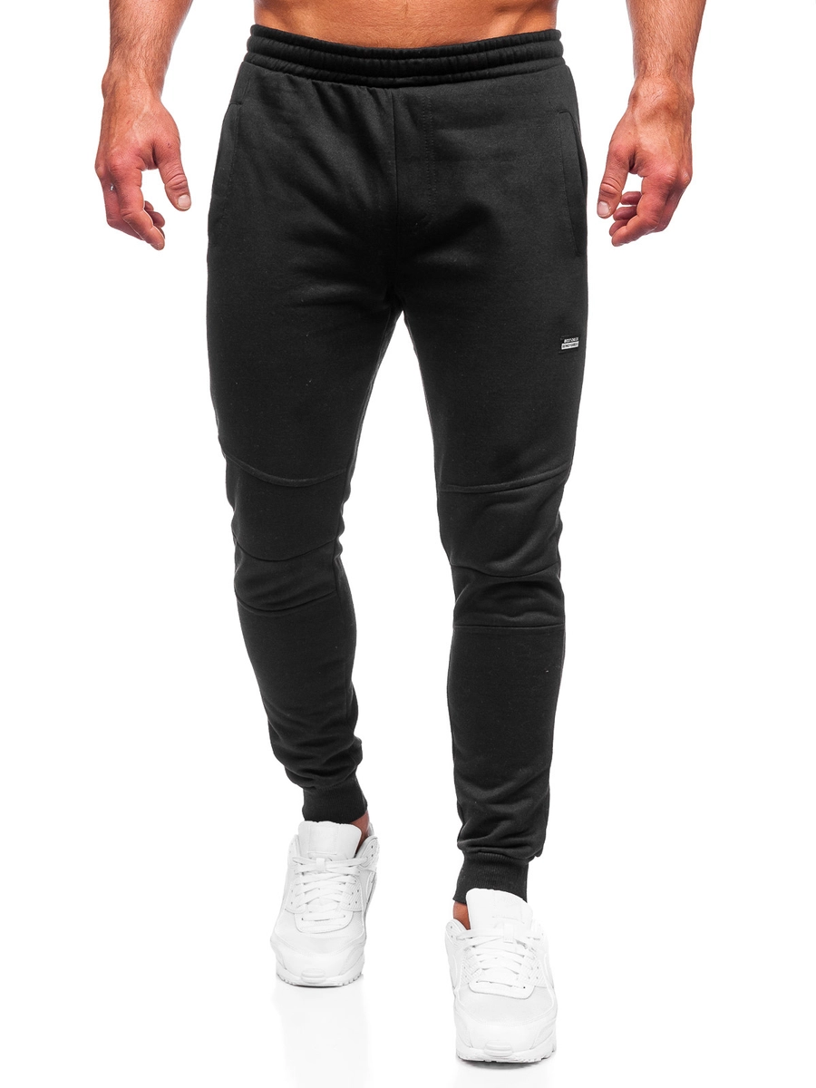 Fina svarta herrsweatpants KK2231 från Bolfs kollektion. De är justerbara i midjan med dragsko och en kraftig passform, tack vare vilken du kan justera dem så att de passar din figur perfekt. Byxorna har två fickor framtill. Ett enkelt snitt och muddar vid bensluten ger dem ett sportigt utseende samtidigt som det gör dem varma under lite kallare dagar. Denna modell kännetecknas av moderiktiga materialsömmar på benen. Skönt mjukt material och bra passform. Du kan ha dem på promenaden, till gymmet eller när du ska träffa kompisarna. Bär dem ihop med en sweatshirt och en T-shirt.