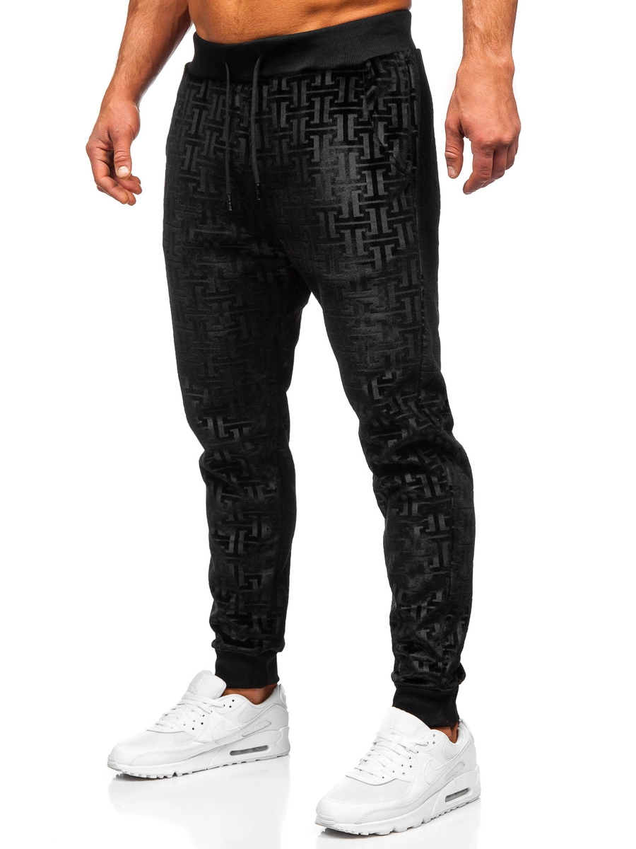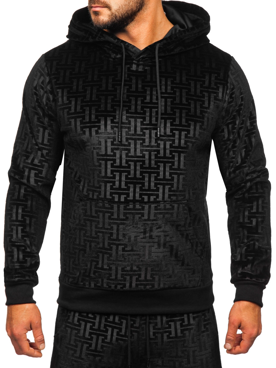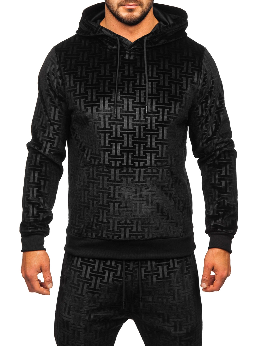 Supersnygg svart herrträningsoverall med huva 3A81 från Bolfs kollektion. Setet består av sweatshirt och sweatpants. Denna tröja har en justerbar huva och en känguruficka. Byxorna är justerbara i midjan med kraftig passform och dragsko samt ytterfickor. Ett enkelt snitt med bra passform ger dem ett sportigt utseende. Den är tillverkad av mjukt och skönt material för en god bekvämlighet. Velourträningsoverallen är ett unikt förslag för att diversifiera vardags- och sportstiliseringar. Både tröjan och byxorna kan kombineras med andra klädesplagg, vilket ger många förslag på en vardagslook. Setet kommer perfekt att matcha en T-shirt och en väst!