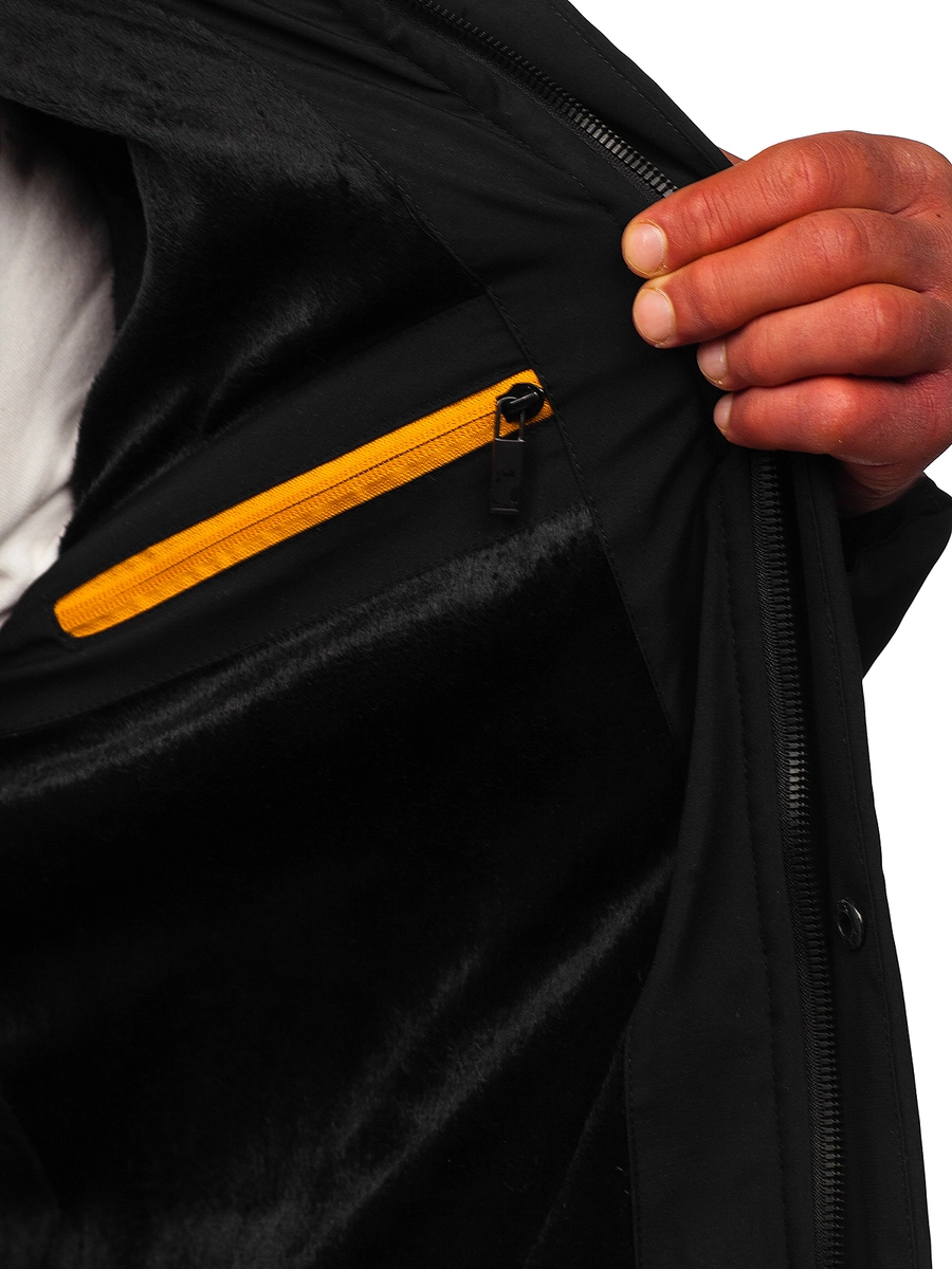 Snygg svart lång quiltad herrvinterjacka 22M57 från Bolfs kollektion. Den knäpps med dragkedja och tryckknappar, har en avtagbar, justerbar huva och en ståkrage. Den har ytterfickor och en framficka, knäppt med dragkedja och en innerficka, där du säkert kan gömma de mest nödvändiga sakerna. Jackan anpassar sig perfekt till figuren tack vare ärmarna som är avslutade med en kant på insidan. En dekorativ applicering på ärmen ger den karaktär. Den quiltade jackan skapar en perfekt look med jeans och en tröja!