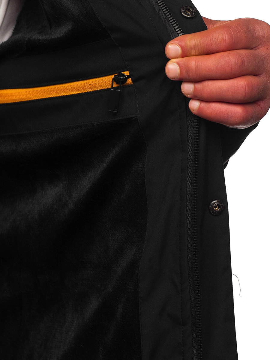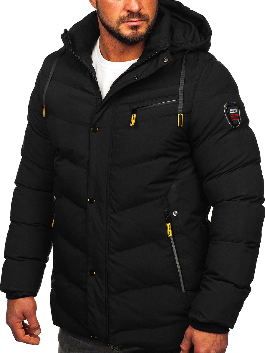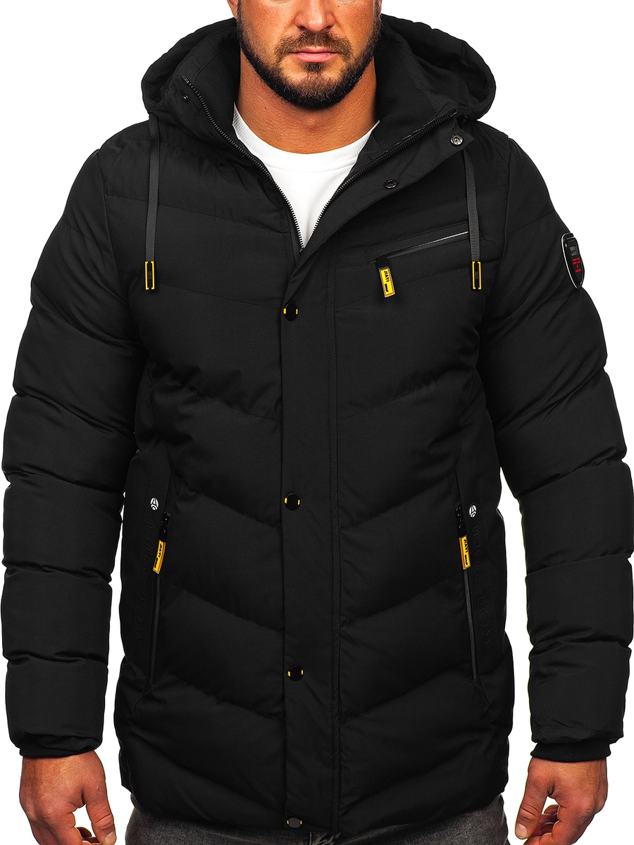 Snygg svart lång quiltad herrvinterjacka 22M59 från Bolfs kollektion. Den knäpps med dragkedja och tryckknappar, har en avtagbar, justerbar huva och en ståkrage. Den har ytterfickor och en framficka, knäppt med dragkedja och en innerficka, där du säkert kan gömma de mest nödvändiga sakerna. Jackan anpassar sig perfekt till figuren tack vare ärmarna som är avslutade med en kant på insidan. Dess karaktär förstärks av en dekorativ applicering på ärmen och en inskription inuti kragen. Den quiltade jackan skapar en perfekt look med jeans och en tröja!