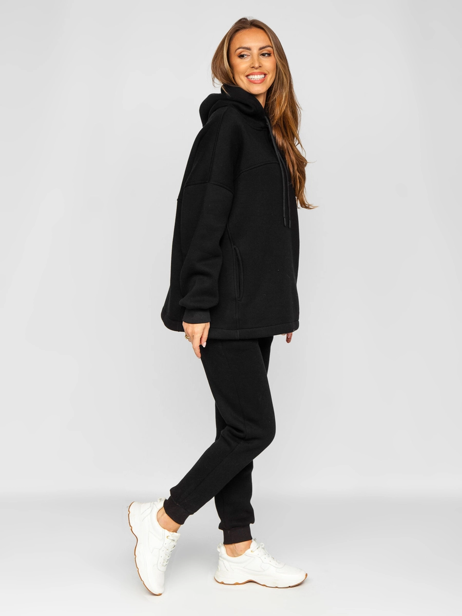 Bekväm svart 2-delad träningsoverall för kvinnor 8029 från Bolf-kollektionen. Tillverkad av högkvalitativ bomull, tack vare vilken den är mjuk och behaglig att ta på, vilket säkerställer bärkomfort. Setet består av en sweatshirt med justerbar huva och byxor med lösare skärning. Det kommer att vara ett utmärkt val både för vardagsbruk, men också för träning eller jogging. Tröjan och byxorna kan bäras tillsammans eller separat, vilket skapar otaliga stilar. Setet kommer att se bra ut med en gilet och träningsskor.