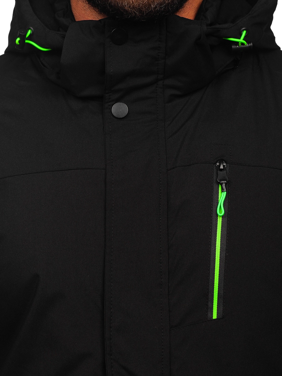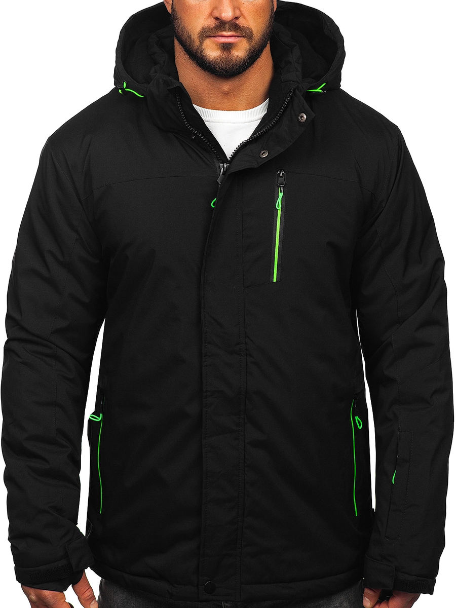 Snygg svart och grön herr vinterjacka 7097från Bolf-kollektionen. Jackan har snöbälte och liftkort på ärmen. Dess ärmar är avslutade med en passform med en megafashionabel tumögla! Jackan knäpps med dragkedja och tryckknappar och har en avtagbar, justerbar huva och en ståkrage. Den har ytter- och bröstfickor med dragkedja och en innerficka med dragkedja, där du säkert kan gömma det mest nödvändiga. Skidjackan kommer att skapa en perfekt look med jeans och en tröja!