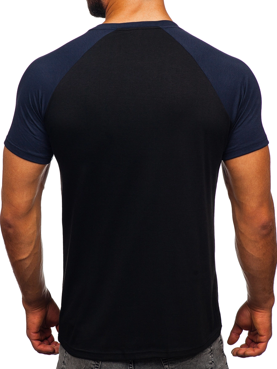 Användbar svart och marinblå herr T-shirt 8T82 från Bolfs kollektion. Den är utrustad med en rund halsringning.Crew neck. En T-shirt är en bra bas för att skapa många olika intressanta stilar. Denna T-shirt passar varje dag, därför är den ett måste ha i varje mans garderob. Kontrasterande materialkombinationer ger den en superfashionabel och distinkt look. Den kommer att passa bra med jeans, cargobyxor eller joggingbyxor.