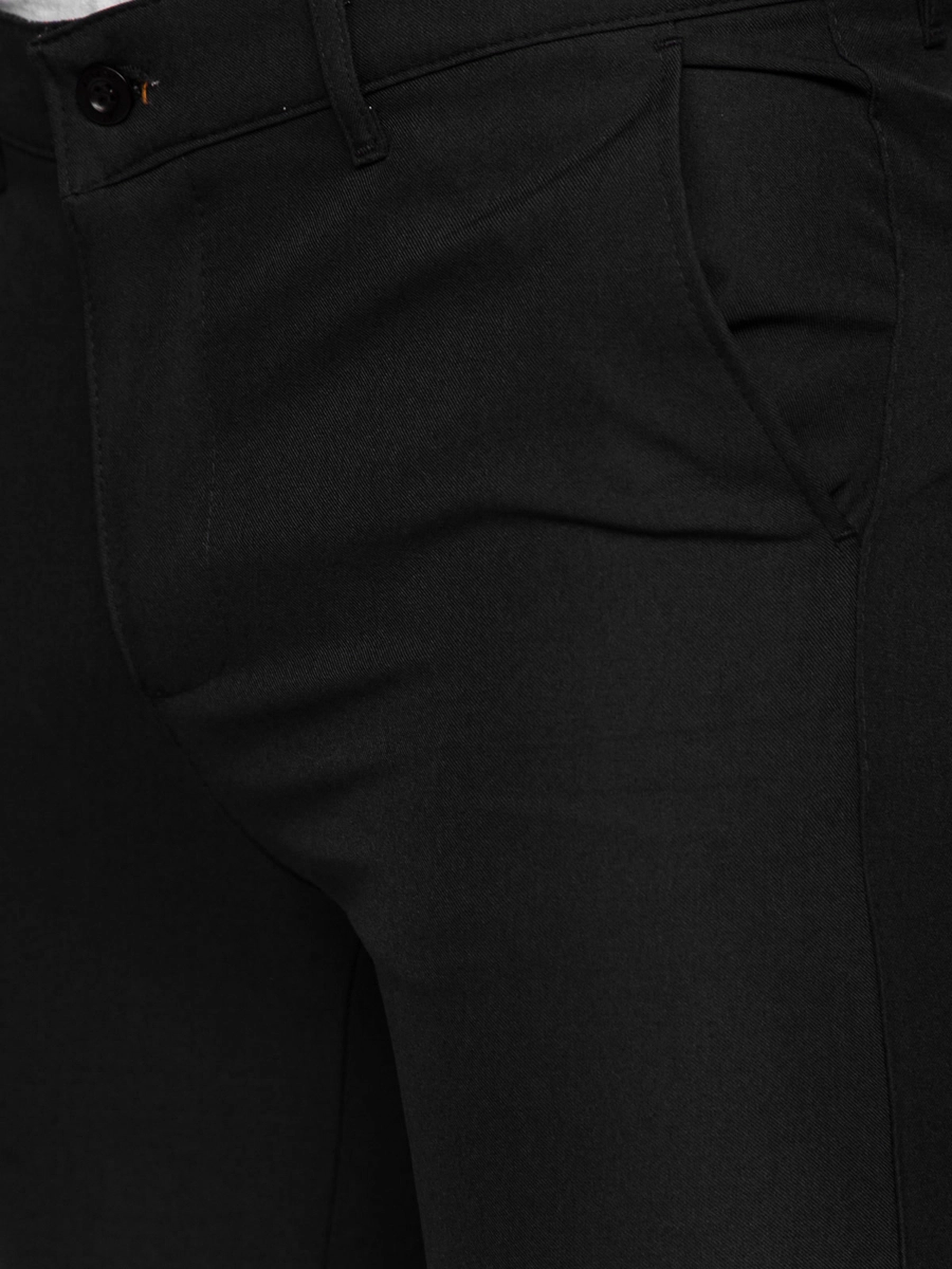 Fantastiska svarta bomullsbyxor för män 0031 från Bolf-kollektionen. Byxor med klassiska långa ben knäpps med dragkedja och knapp. Den här modellen har praktiska fickor där du kan bära med dig de viktigaste sakerna. Två är placerade på baksidan och två på framsidan. De är gjorda av material av högsta kvalitet vilket gör dem extremt bekväma och behagliga att ta på. Chinos är universella, bekväma, praktiska och ser alltid bra ut. Kombinera dem med en läderjacka och en T-shirt så får du stilar perfekta för nästan alla tillfällen.