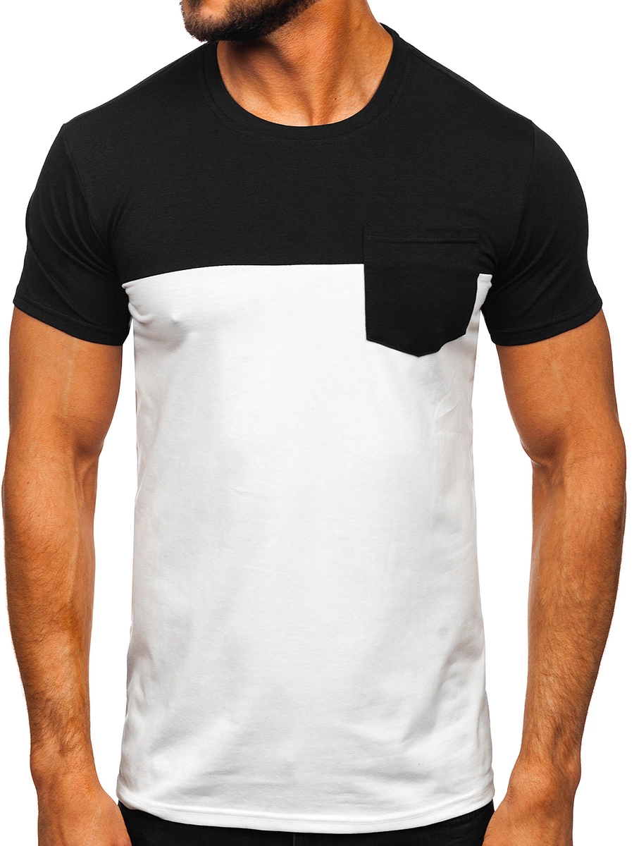 Uttrycksfull svart och vit herr-T-shirt med ficka 8T91 från Bolf-kollektionen. Den var gjord av högkvalitativa material, vilket garanterar inte bara hållbarhet utan också bärkomfort. Svarta och vita färger ger den en universell karaktär som passar perfekt med olika stiliseringar. En extra del av denna T-shirt är en praktisk ficka på bröstet. Fickan ger inte bara en snygg touch, utan ger även plats för förvaring av småsaker. En T-shirt kommer att se bra ut med jeans eller cargobyxor.