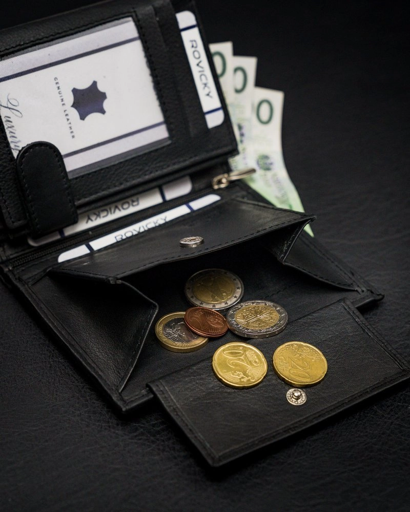 - mynt kan förvaras i 1 ficka, stängs med ett tryckknapp.
