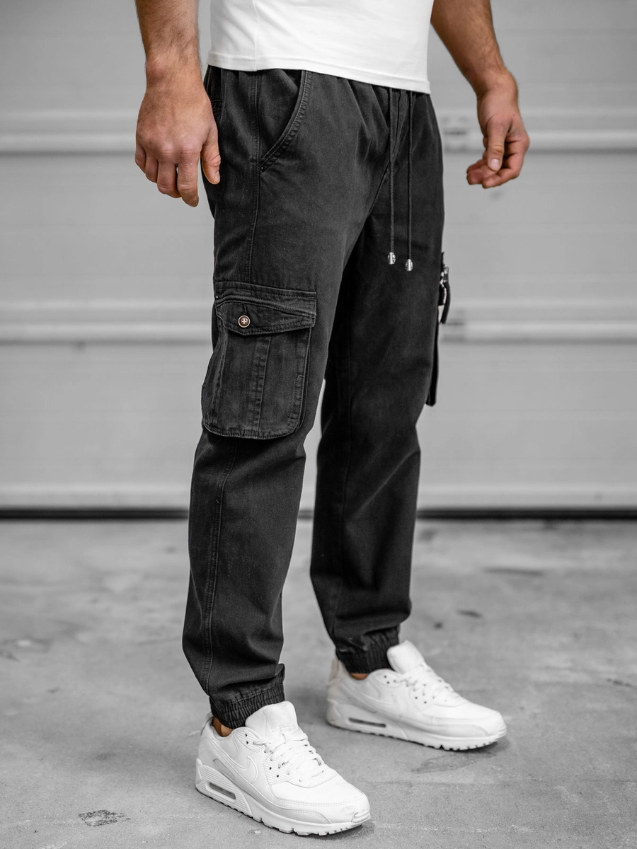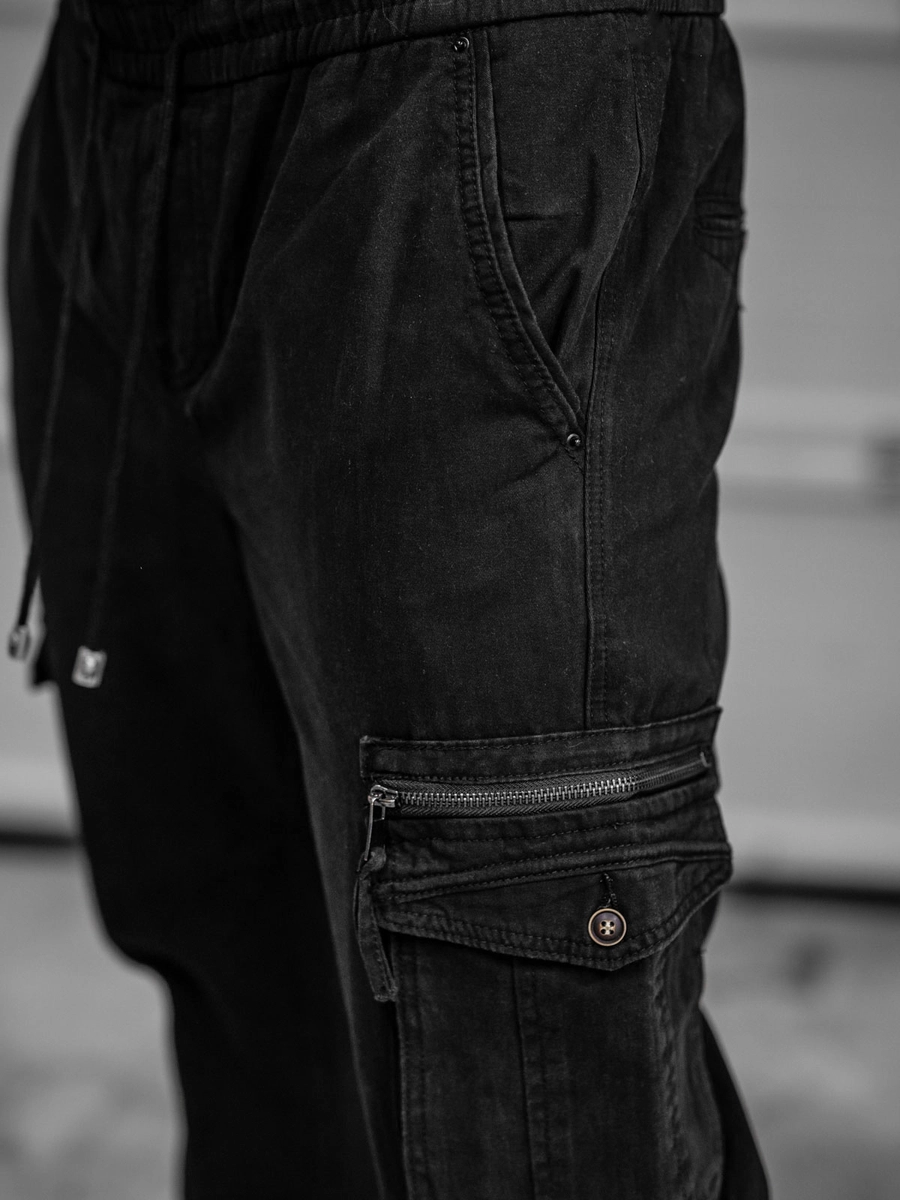 Snygga svarta herr cargojoggers MP0181NA från Bolfs kollektion. Tack vare att de kan justeras i midjan med en kraftig resår och dragsko anpassar de sig perfekt efter kroppen. De har klassiska fickor framtill, bakfickor med knapp och sidfickor med lock som knäpps med knapp. Det dekorativa elementet är en fashionabel imitation av en ficka med dragkedja. Nertill finns en mudd som skyddar inte bara ser bra ut, den skyddar även bra mot kyla och vind. De är gjorda av 100% bomull. Tack vare material av högsta kvalitet kommer du att känna dig bekväm att bära dem. Joggare kommer att se bra ut med en T-shirt och en tröja.