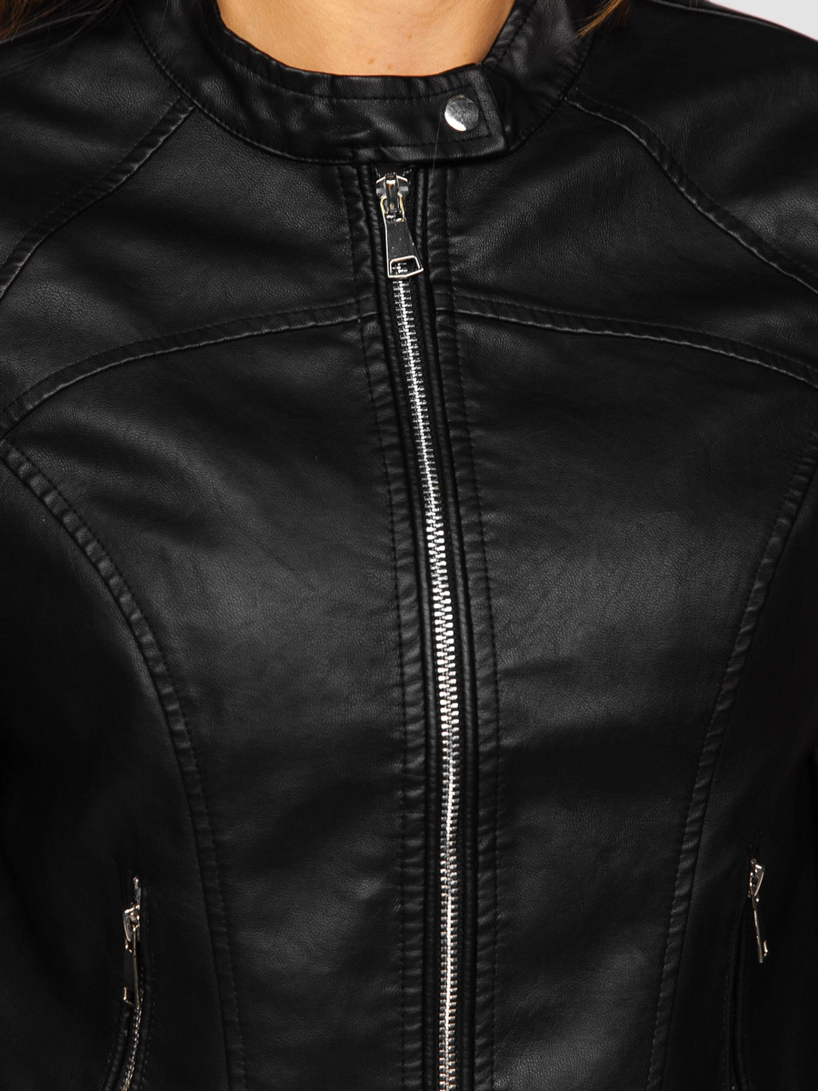Vacker svart läderjacka för kvinnor 11Z8032 från Bolf-kollektionen. Tillverkad av högkvalitativa material ger den inte bara ett unikt utseende, utan också hållbarhet och komfort när du bär den. Svarta färger ger tidlöshet och mångsidighet till jackan. Det är inte bara ett moderiktigt plagg, utan också ett utmärkt skydd mot kyla och vind, varför det är perfekt för övergångsperioden och för kallare dagar. Den kommer att vara perfekt både för vardagsbruk och till jobbet eller en dejt. Para ihop den med byxor eller en klänning.