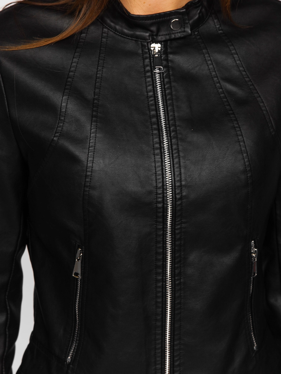 Bekväm svart läderjacka för kvinnor 11Z8033 från Bolf-kollektionen. Knäpps med dragkedja, med ståkrage och rak fåll. Tillverkad av material av högsta kvalitet, ger den inte bara ett unikt utseende, utan också hållbarhet och komfort. Jackan passar både vardagliga outfits med jeans och en T-shirt, samt mer eleganta set med en klänning eller en kjol.