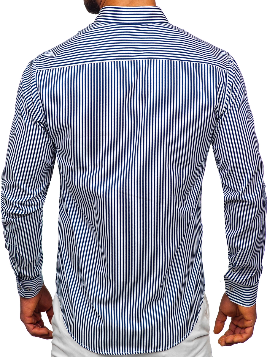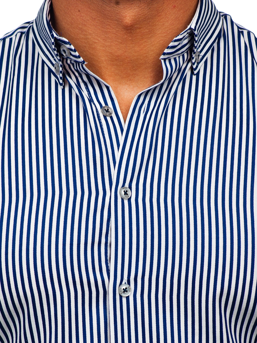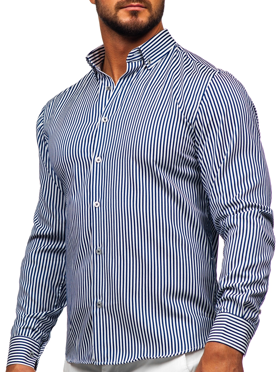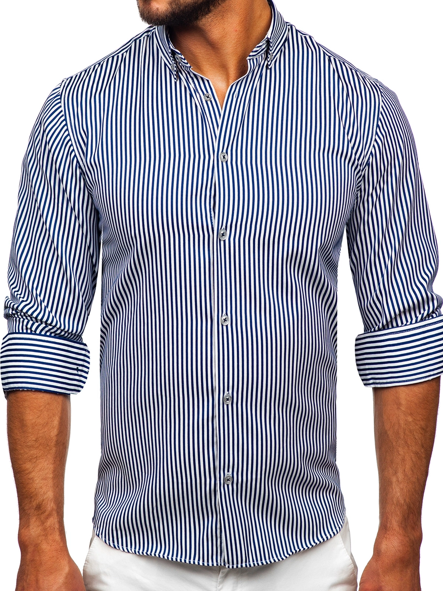 Must have randig långärmad skjorta 22731 från Bolf-kollektionen. Knäpps med knappar, med justerbara ärmslut. Tillverkad av 80% bomull och 20% polyester, vilket gör den väldigt behaglig att ta på och bekväm. Den slankar silhuetten perfekt och accentuerar axlarna. Denna eleganta skjorta passar för officiella tillfällen, där den kommer att vara fantastisk i kombination med en jacka, men också för mer avslappnad styling, för en dejt eller en födelsedagsfest. Finns i elva färger.