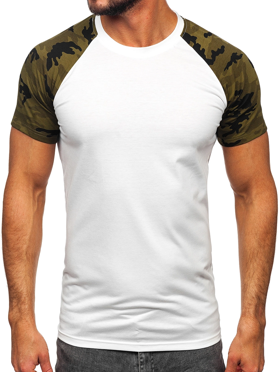 Användbar vit och camo herr T-shirt 8T82 från Bolfs kollektion. Den är utrustad med en rund halsringning.Crew neck. En T-shirt är en bra bas för att skapa många olika intressanta stilar. Denna T-shirt passar varje dag, därför är den ett måste ha i varje mans garderob. Kontrasterande materialkombinationer ger den en superfashionabel och distinkt look. Den kommer att passa bra med jeans, cargobyxor eller joggingbyxor.
