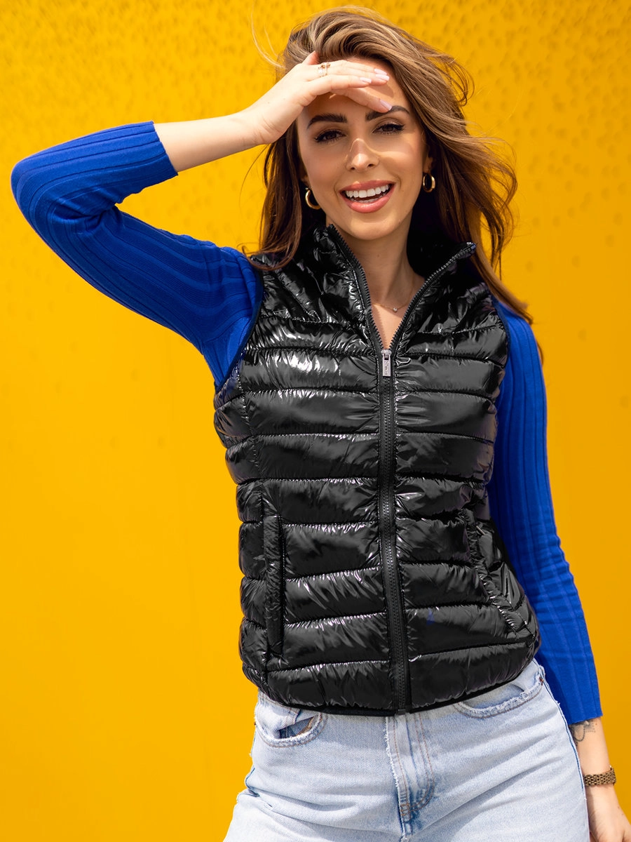 Snygg quiltad svarta damväst med huva R0107AA från Bolfs kollektion. Quiltning över hela västen ger den ett sportigt intryck. Det finns en dragkedja och en stå-upp krage. Dess två utvändiga fickor med dragkedja ger den praktisk karaktär. Den är tillverkad av 100% nylon, vilket gör den extremt bekväm. Den här västen med ett klassiskt snitt är ett utmärkt alternativ till jackan under höst och vår. Den kan ersätta övergångsjackan eller till och med en tröja då den ger bra skydd mot kyla och vind. Västen kan användas som bas i många moderiktiga stilar. Den passar bra med ett par sweatpants för att skapa en sportig, ledig stil. Passar med jeans och en T-shirt.