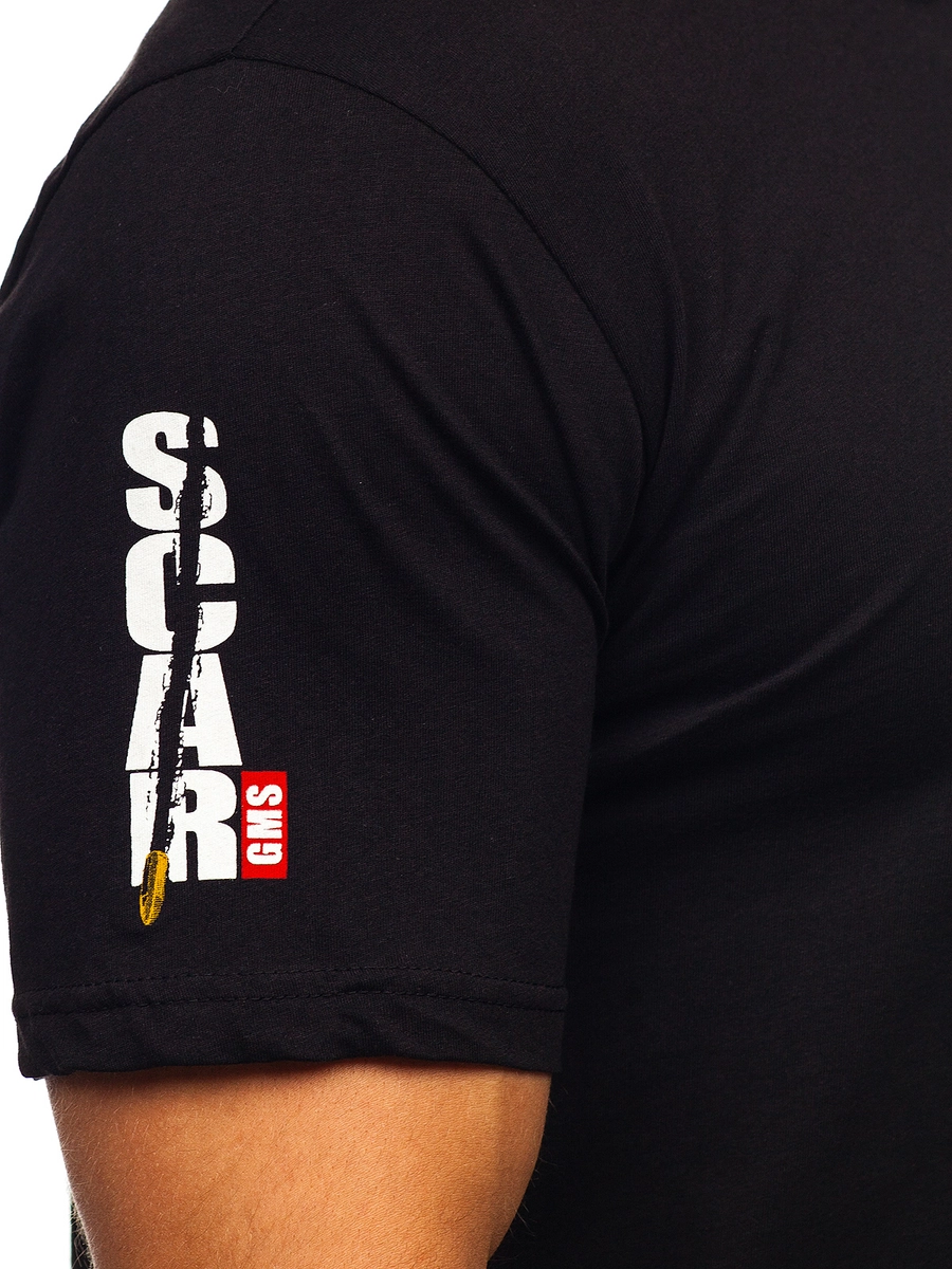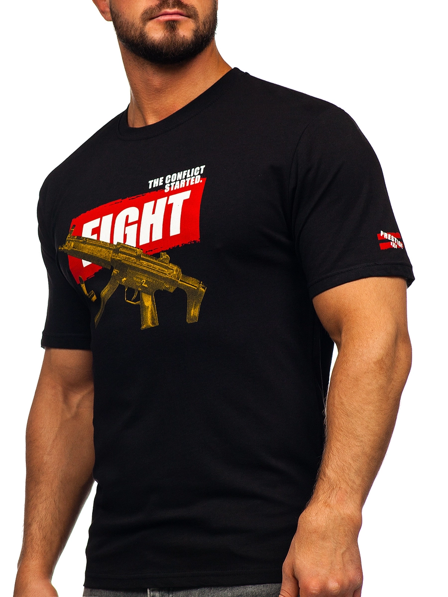 Snygg svart herr bomulls T-shirt 14709 från Bolfs kollektion. En rak T-shirt med rund halsringning passar varje figur. Den är tillverkad av 100% bomull vilket gör den väldigt mjuk och otroligt bekväm. Tack vare originaltrycket på framsidan har T-shirten ett unikt utseende. Perfekt för sportiga stilar och som komplement till många olika vardagsstilar. Du kan få en klassisk, sportig outfit genom att kombinera en trendig T-shirt med träningsbyxor och en tröja!