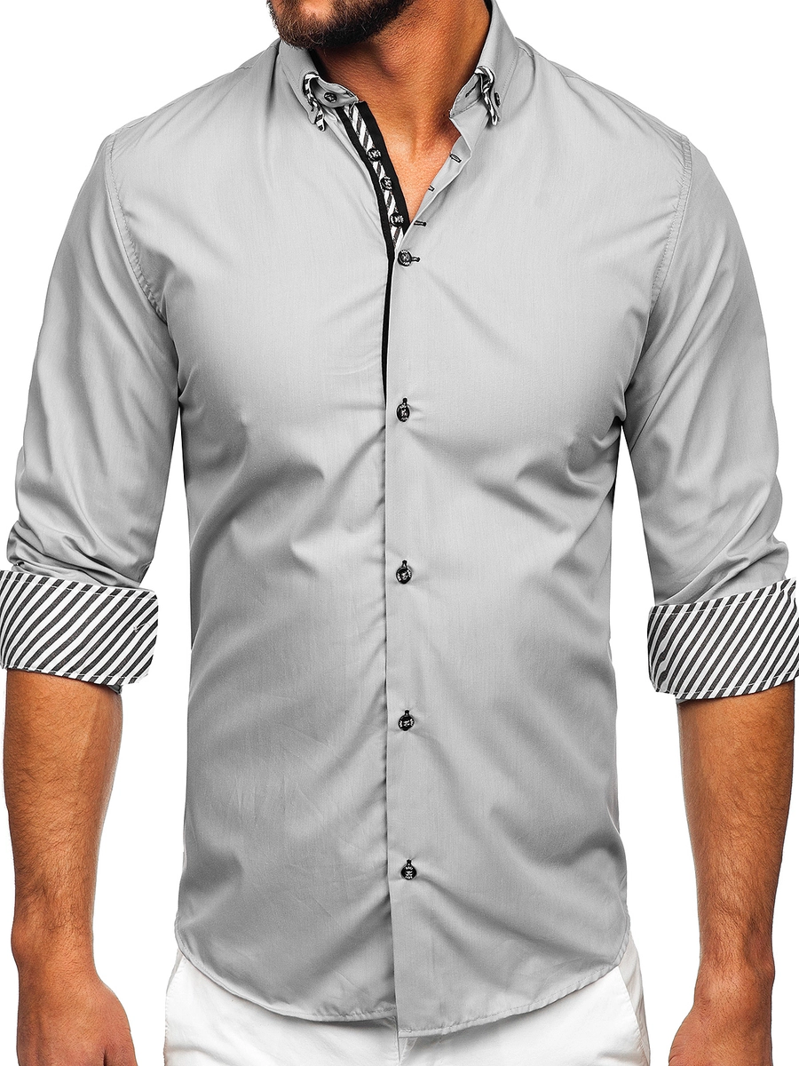 Utmärkt grå långärmad slim fit herrskjorta från Bolfs kollektion. De lägger till stil och ser bra ut med jeans eller chinos. Herrskjortan har en intressant krage och ett dekorativt fäste. Bär den under en kavaj.