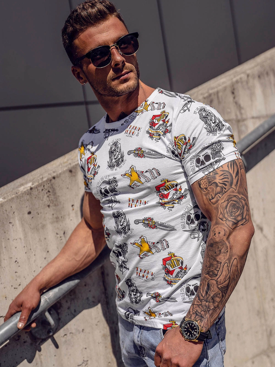 Perfekt T-shirt med tryck för män 14963A från Bolf-kollektionen. Perfekt för att träffa vänner, gå ut på stan eller varje dag. Tillverkad av 100% bomull, vilket gör den mjuk och smidig. Skärningen med smal passform framhäver figuren perfekt, och designmönstret på hela ytan ger den en moderiktig karaktär. Det kommer att se fantastiskt ut med baggy byxor. Tillgänglig i flera olika färger.