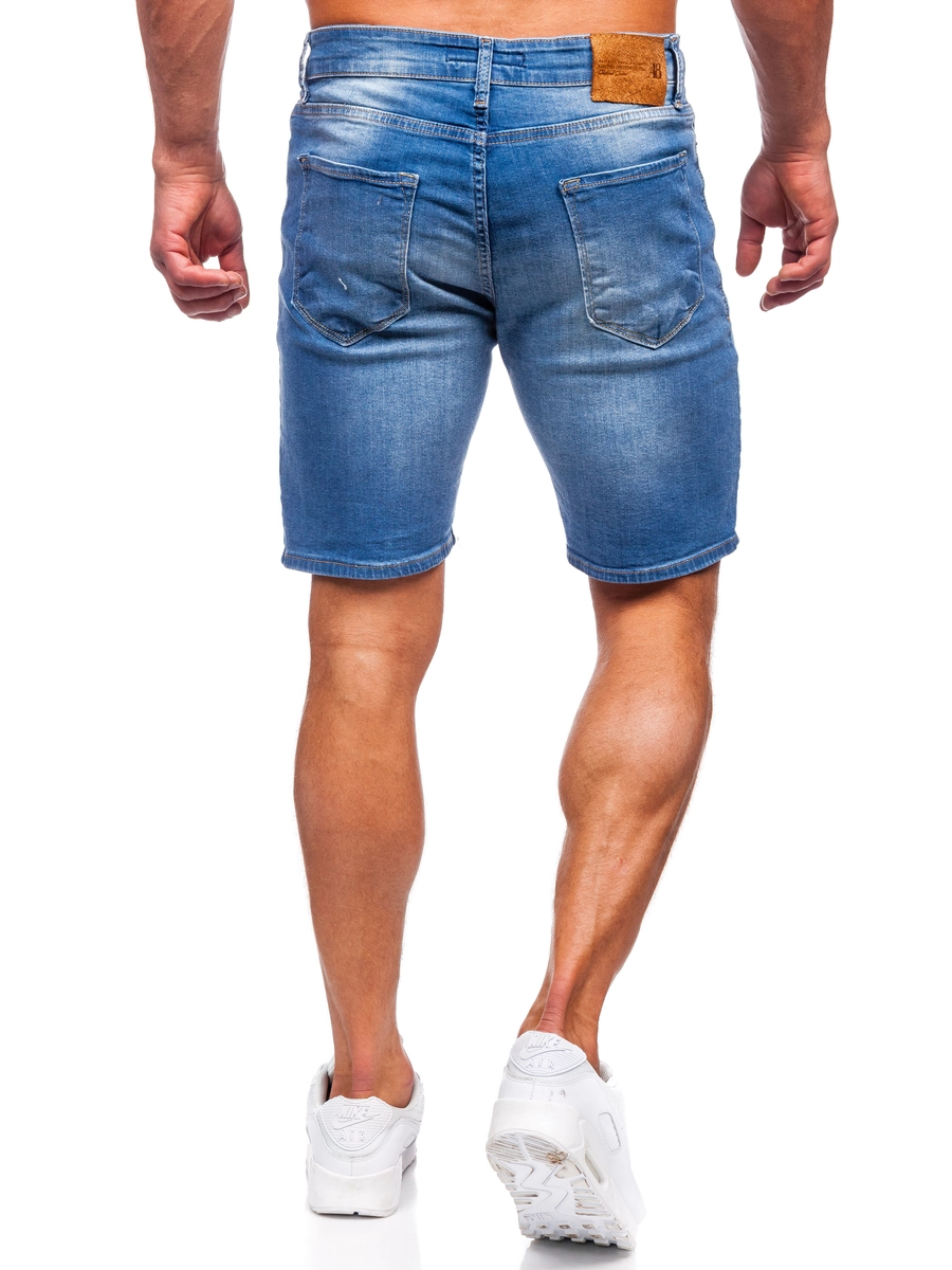 Bekväma och fashionabla marinblå jeansshorts för män 0458 från Bolf-kollektionen. Tillverkade av högkvalitativ denim, de är bekväma och hållbara. Genväg, som når över knäna, vilket ger dem en ungdomlig och fräsch look. De har två fickor fram och bak, vilket gör dem mycket praktiska och funktionella. Färgen är elegant och samtidigt lätt att kombinera med andra inslag i garderoben. De kan bäras både på stranden, i parken och varje dag. Kombinera dem med en T-shirt med tryck och en tröja med dragkedja.