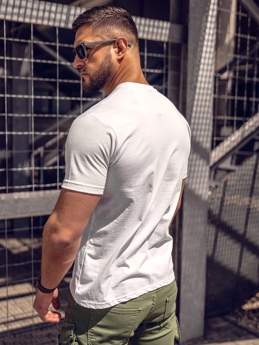 Klassisk vit T-shirt för män CMR18A från Bolf-kollektionen. Tillverkad av högsta kvalitet bomull, ger den komfort när du bär. Den är mjuk och behaglig att ta på och flexibel. Den passar perfekt och framhäver figuren. Designertryck på framsidan ger den lite rockkaraktär. T-shirten kommer att vara perfekt för många stiliseringar för olika tillfällen, varje dag, ett möte med vänner eller en konsert. Kombinera den med en läderjacka och joggingbyxor för att skapa en moderiktig och snygg outfit för att gå ut.
