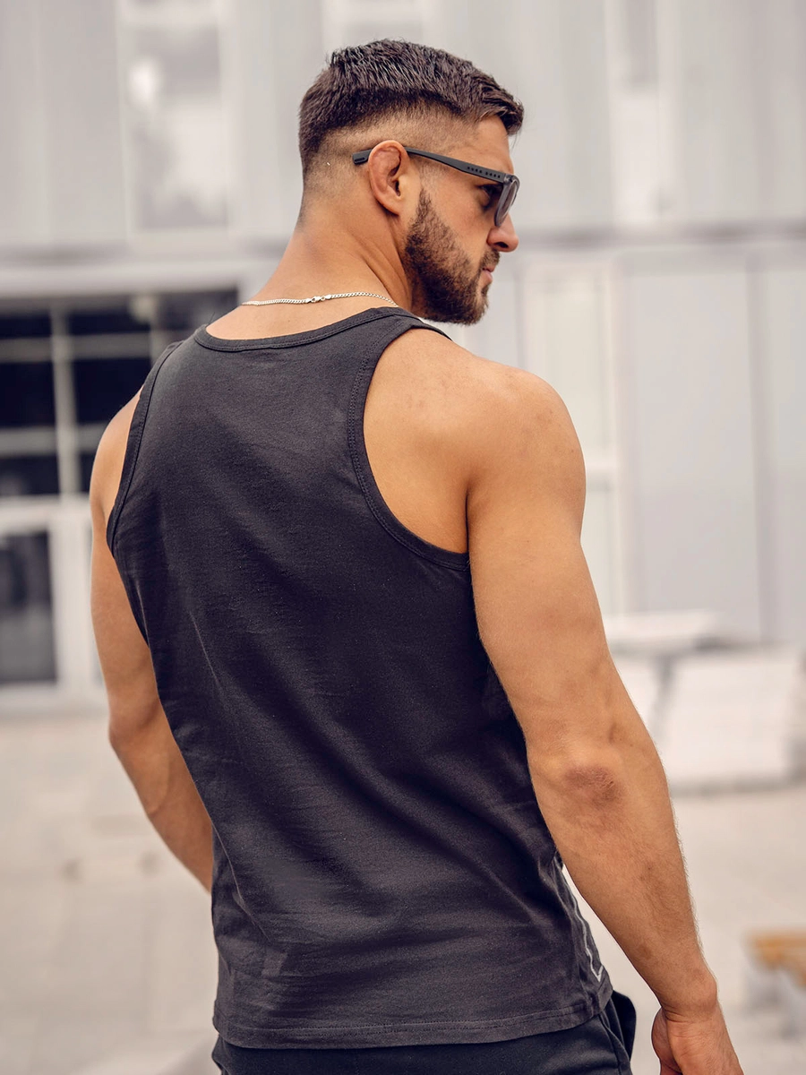 Unikt svart boxerlinne med tryck för män 14846A från Bolf-kollektionen. Tillverkad av lätt och luftigt material, ger den maximal bärkomfort även under varma dagar. Det är ett idealiskt alternativ för personer som värdesätter rörelsefrihet och komfort. Den kan bäras både som en självständig del av outfiten med shorts, såväl som i kombination med andra klädesplagg, en tröja eller en denimjacka.
